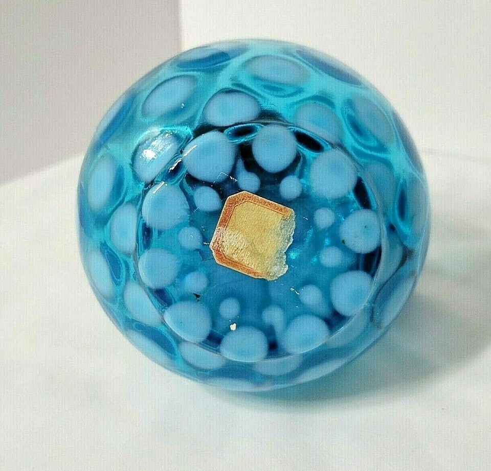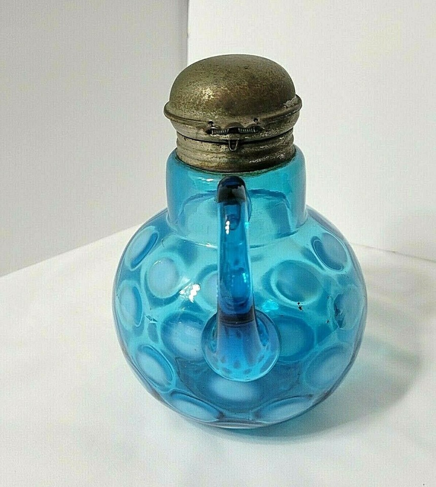 - Coin Dot Syrup Dispenser Vtg Blue Opalescent Glass Pitcher Cruet Metal Lid 6"