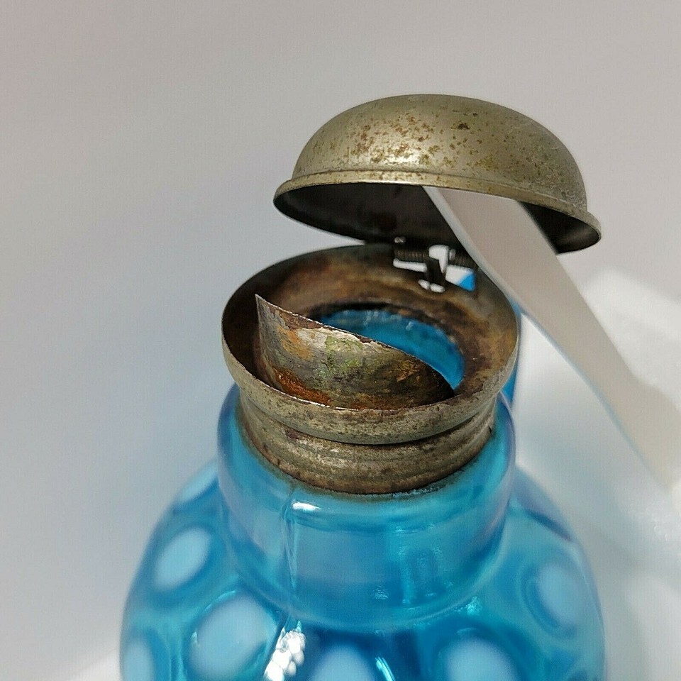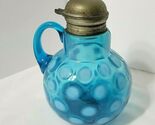 Coin Dot Syrup Dispenser Vtg Blue Opalescent Glass Pitcher Cruet Metal Lid 6"