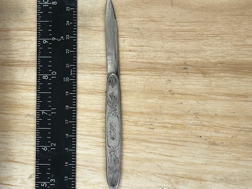 Coin Silver flat handle TEA KNIFE BEADED 7 1/4" in the pattern COIN SILVER BY UNKNOWN. It is monogrammed (monos vary) and is in excellent condition.