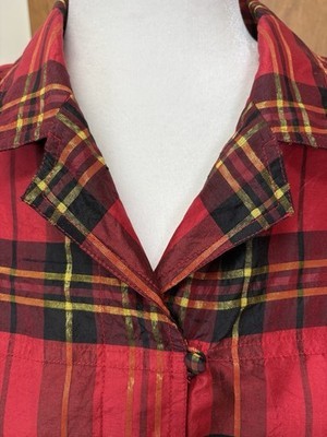 Cold water Creek Red Plaid Silk Top Womens Sz L Tartan Holiday Christmas Classic
