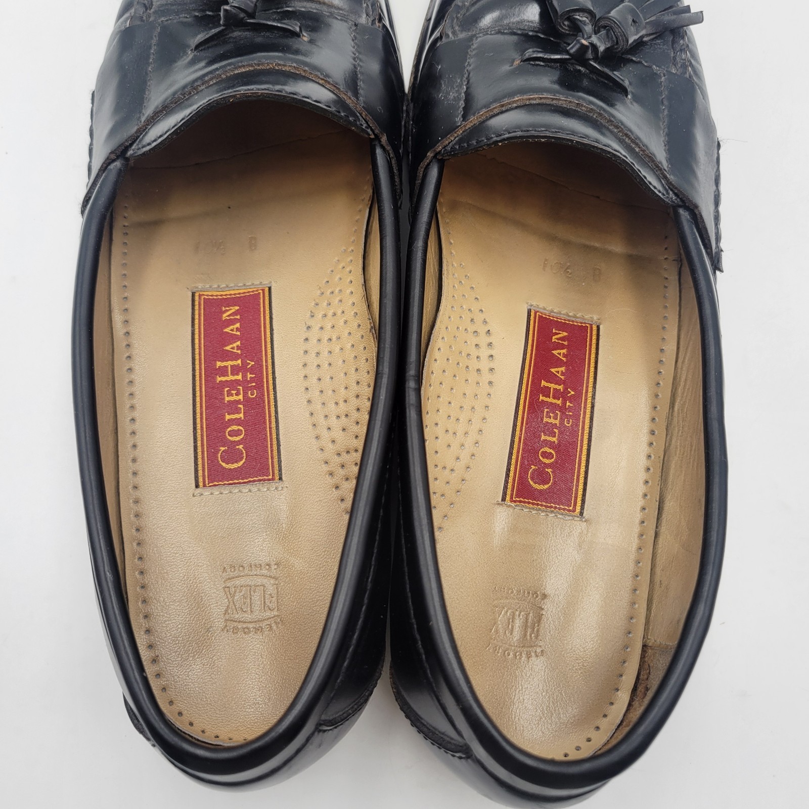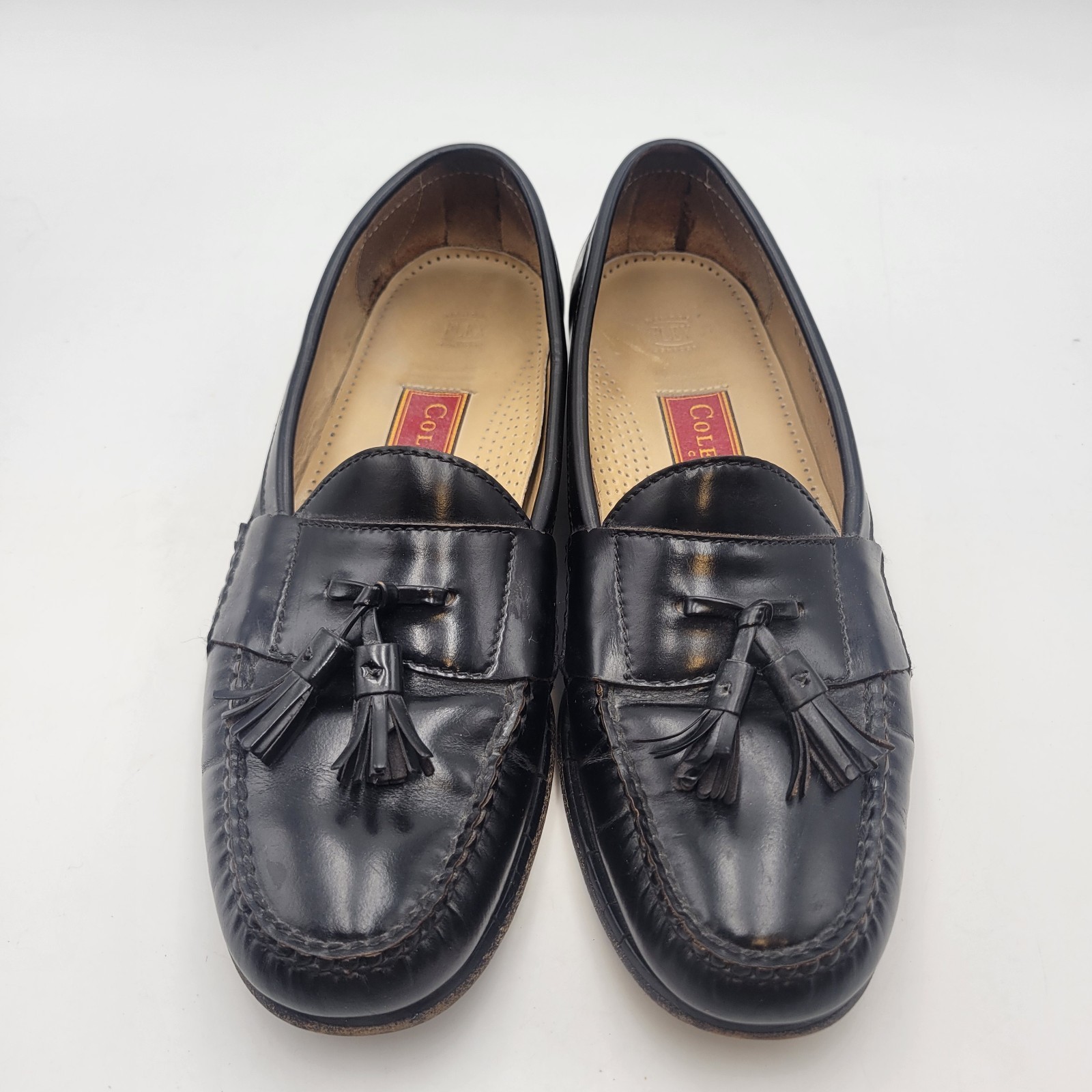 The product is a pair of vintage Cole Haan black leather tassel loafers in size 10.5.