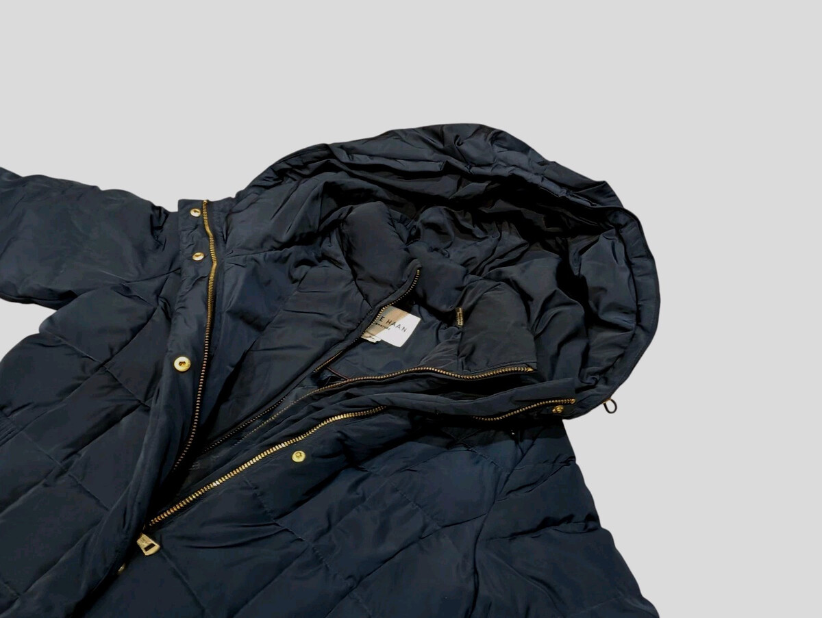 This is a beautiful woman's Cole haan signature knee length quilted winter coat. Navy blue. Down filled interior. This jacket is VERY WARM !! It's very heavyweight. Attached Hood. Perfect for harsh winter weather.