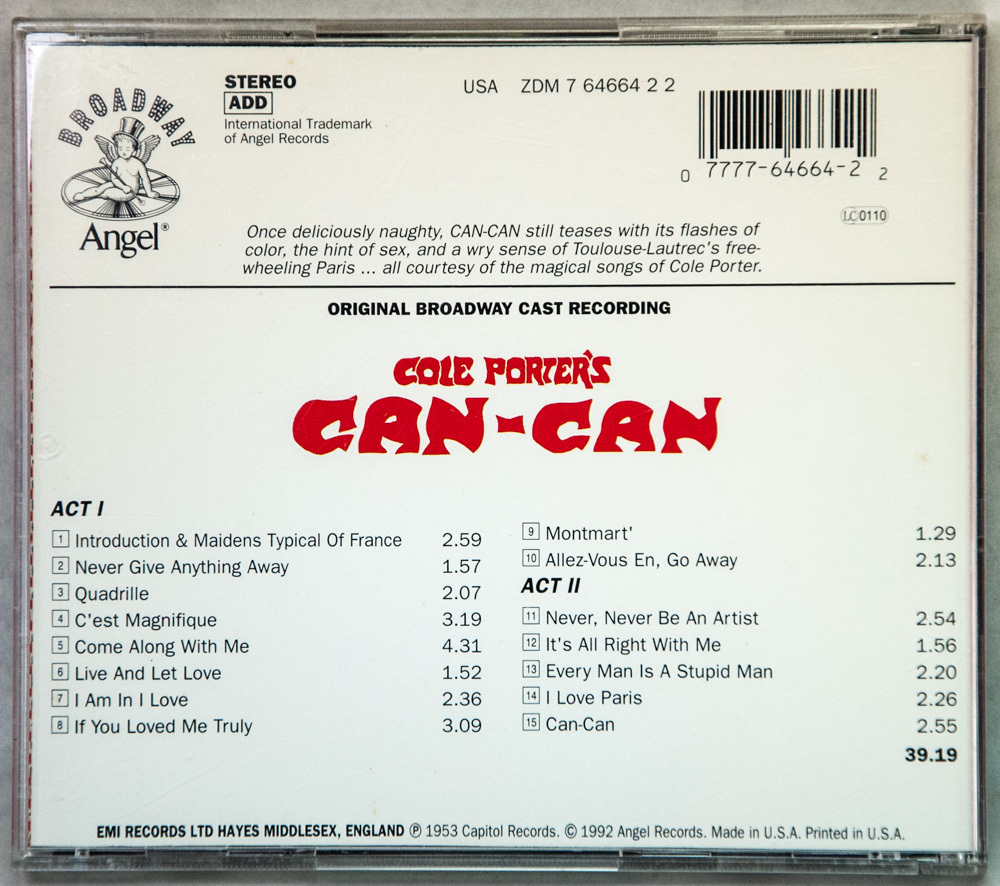 Can-Can, music and lyrics by Cole Porter. This is an Original Broadway Cast Recording by Capitol Records in 1953. This release is from 1992 by Angel Records. CD, booklet and case are in very good condition. Booklet discusses development of the idea and the casting for the show, then reviews the story line.