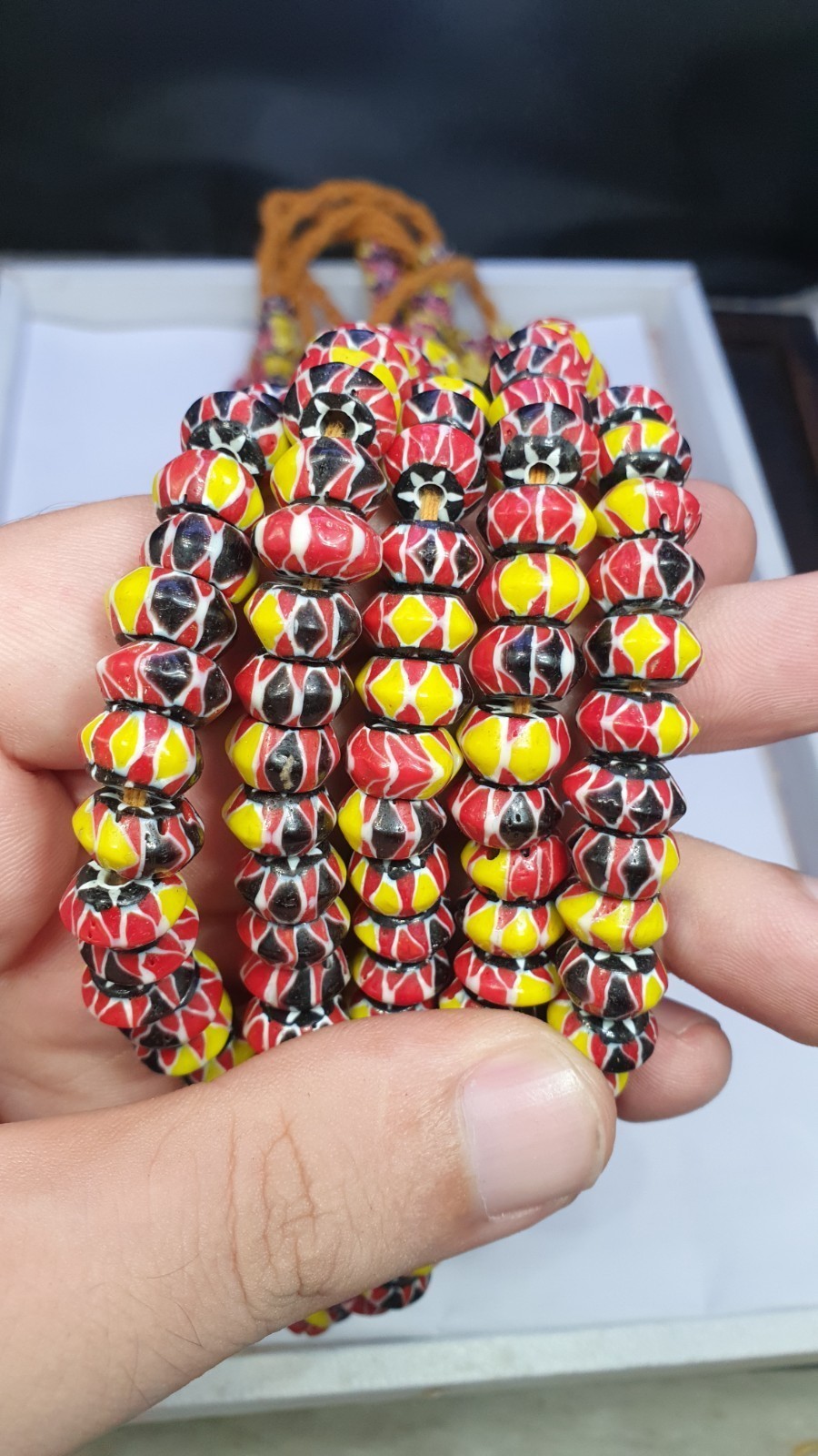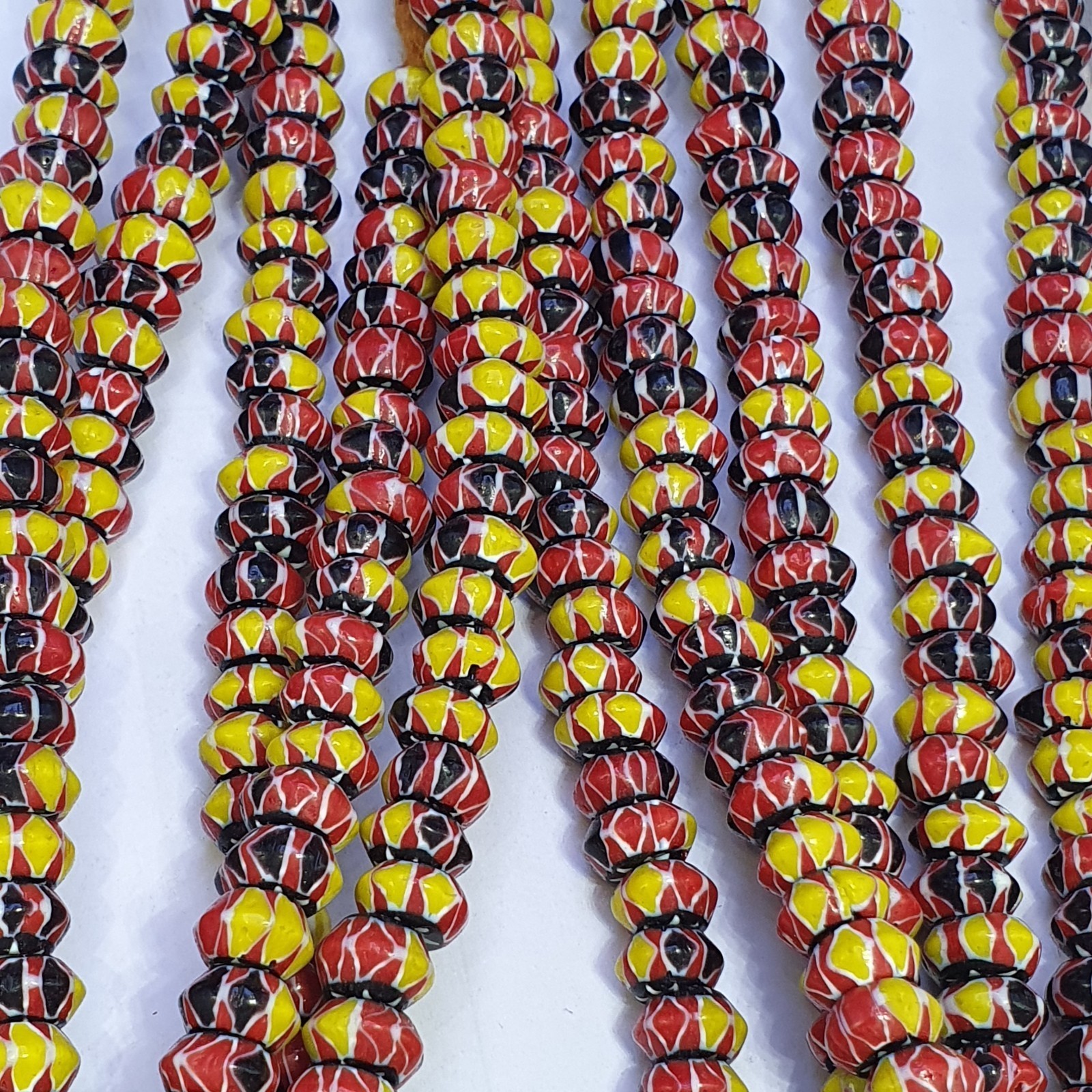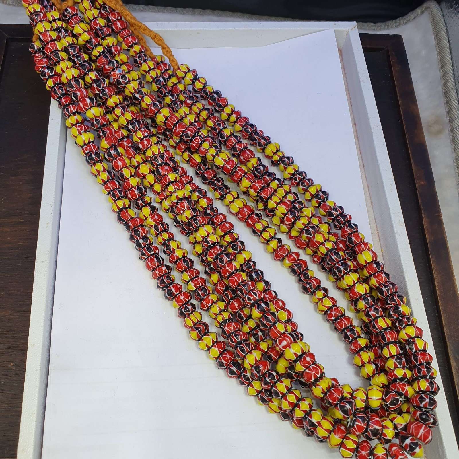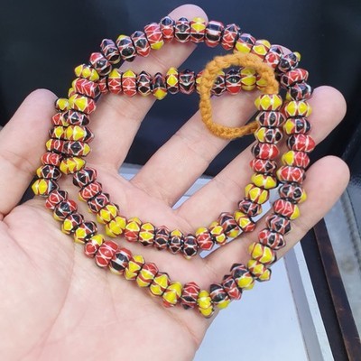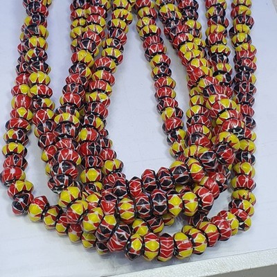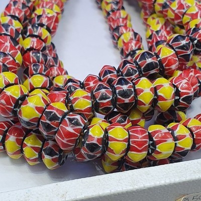 Questa collana di perle in vetro multicolore di ispirazione veneziana presenta perline chevron rosse e gialle da 10 mm incastrate insieme in un filo. Fatta a mano con delicata lavorazione artigianale, questa collana unica aggiunge un tocco di colore e fascino a qualsiasi outfit. Perfetto per i collezionisti o per coloro che desiderano aggiungere un tocco creativo alla propria collezione di gioielli.