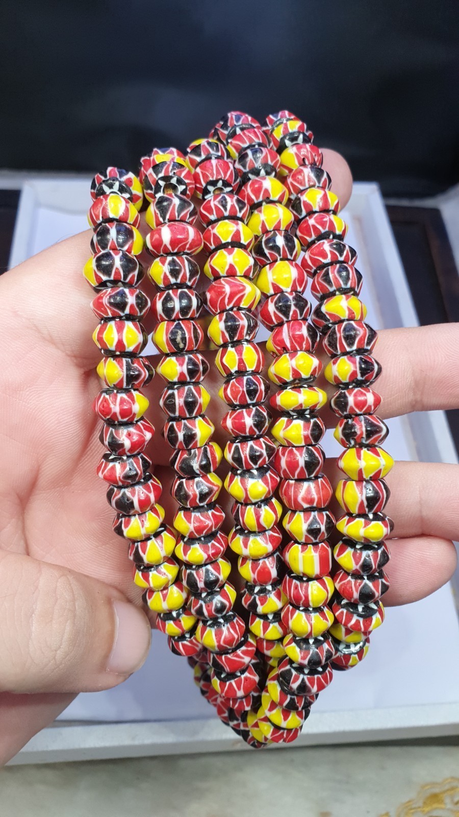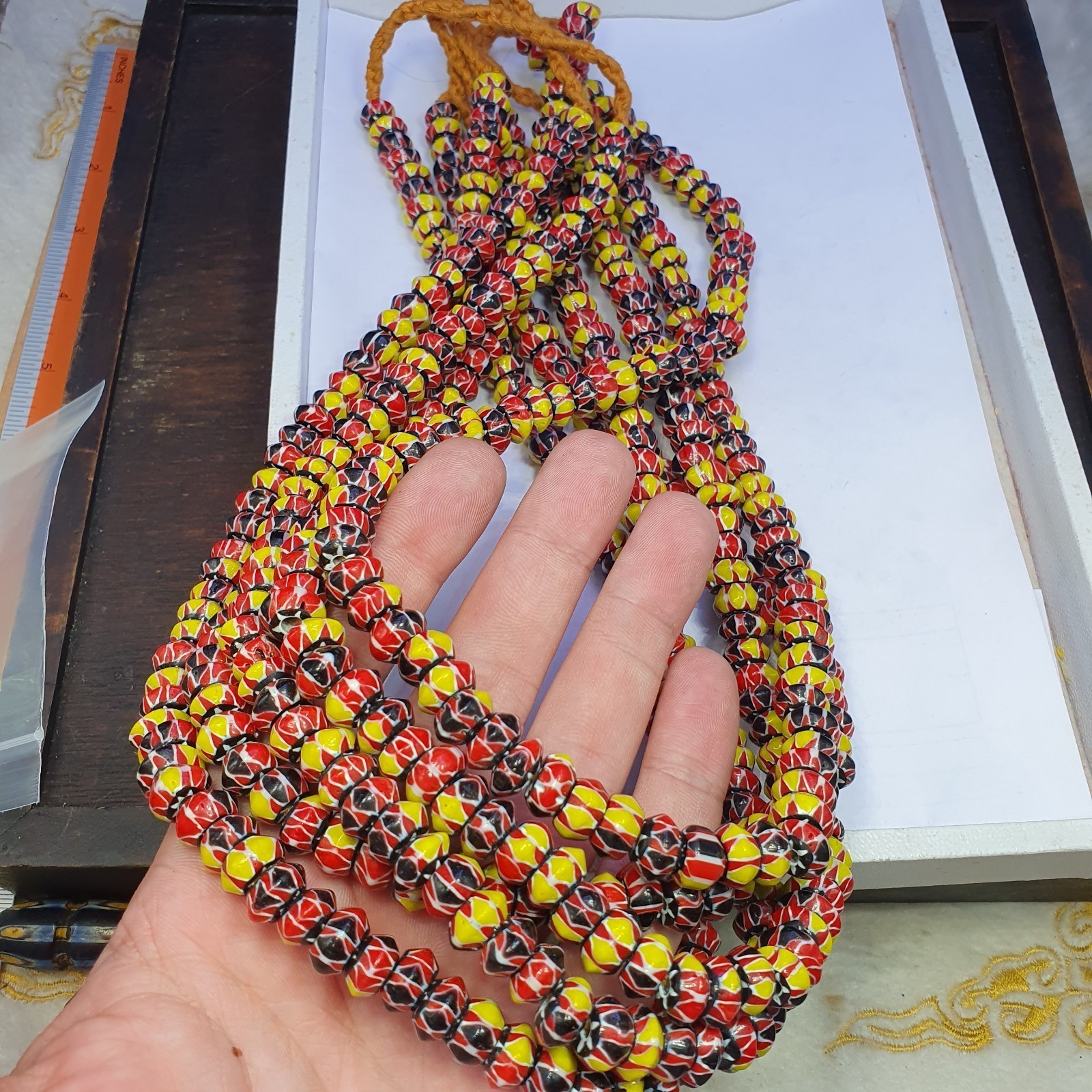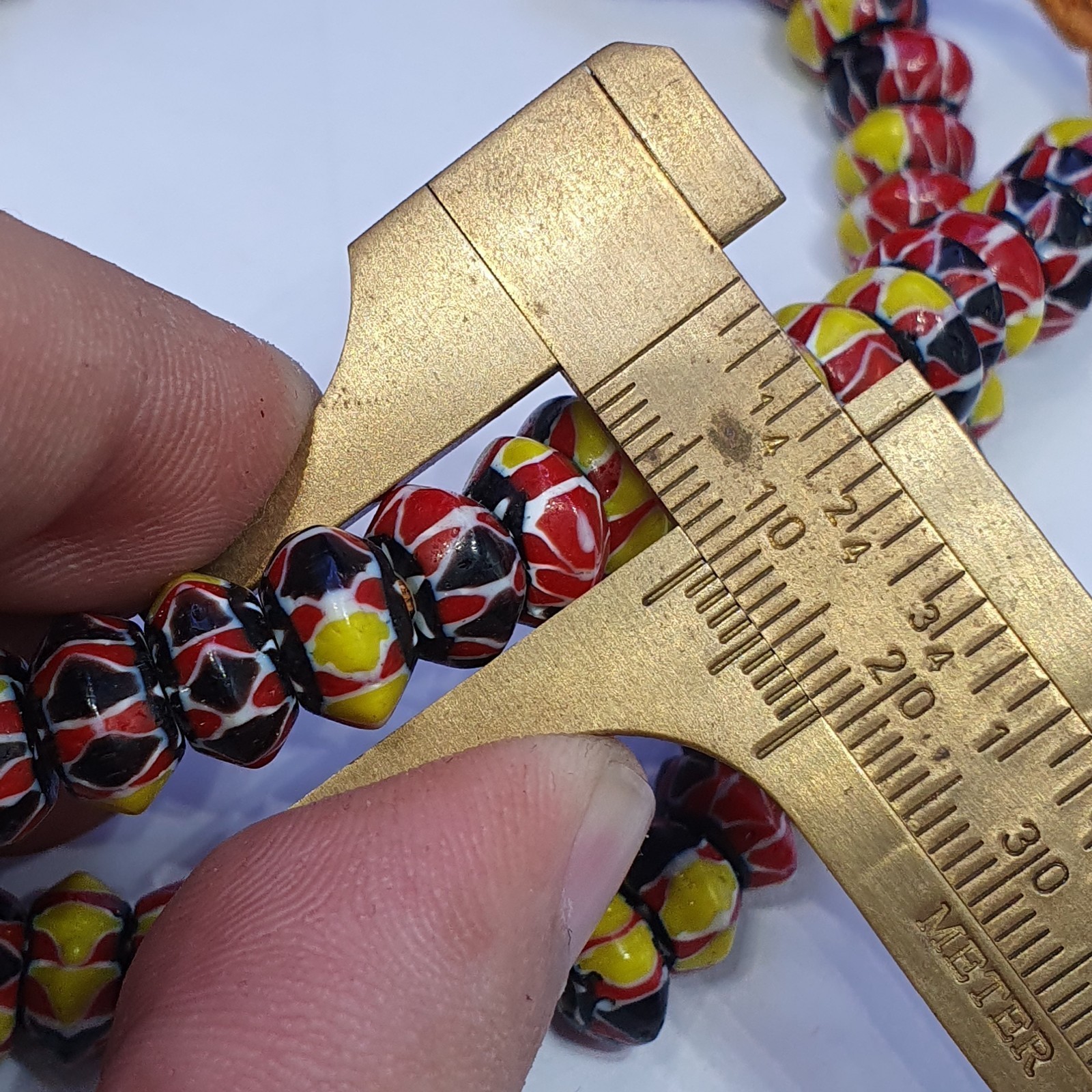 Questa collana di perle in vetro multicolore di ispirazione veneziana presenta perline chevron rosse e gialle da 10 mm incastrate insieme in un filo. Fatta a mano con delicata lavorazione artigianale, questa collana unica aggiunge un tocco di colore e fascino a qualsiasi outfit. Perfetto per i collezionisti o per coloro che desiderano aggiungere un tocco creativo alla propria collezione di gioielli.