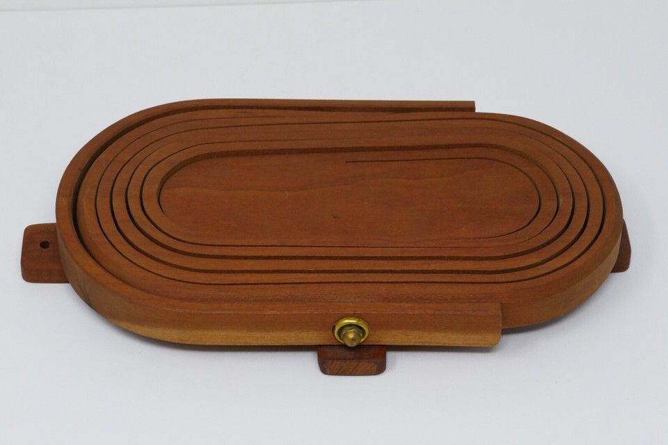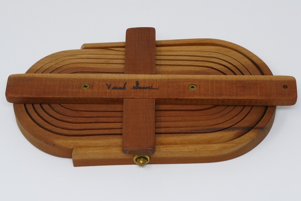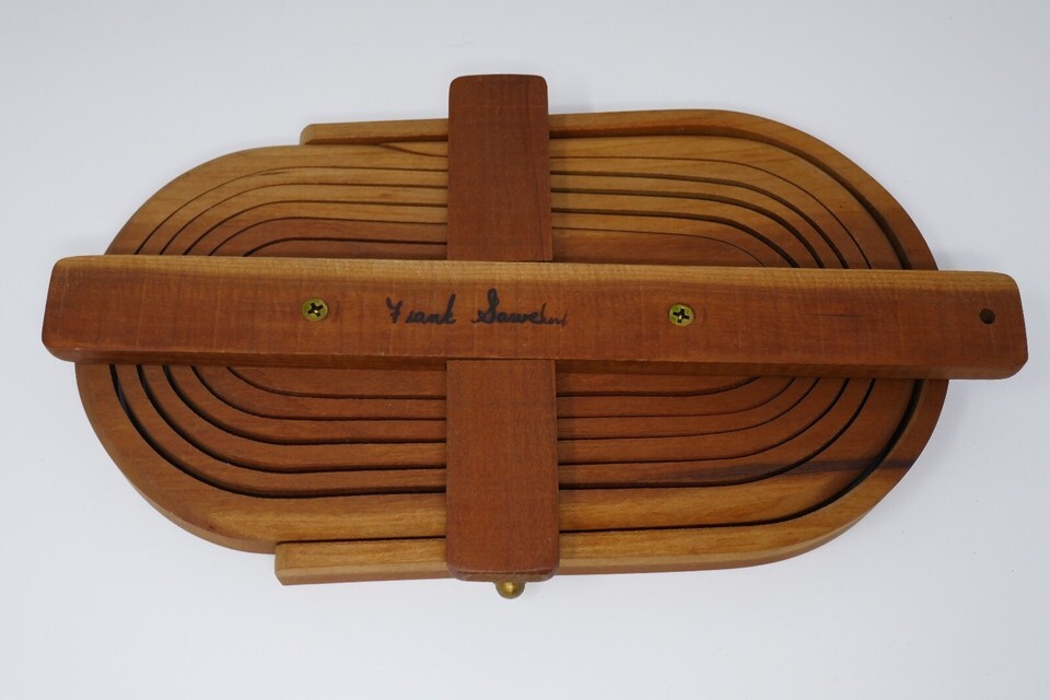 Up for sale is a Collapsible Folding Wooden Bowl Basket. This is signed at the bottom by the artist. Measures approx. 9" x 5" and opens to 3" tall.