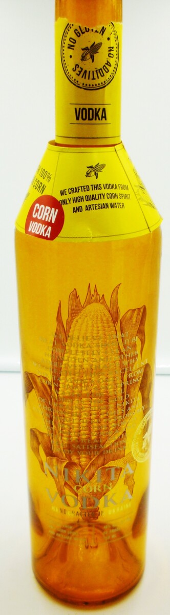 - COLLECTIBLE EMPTY YELLOW GLASS LIQUOR BOTTLE NIKITA CORN VODKA 750ML