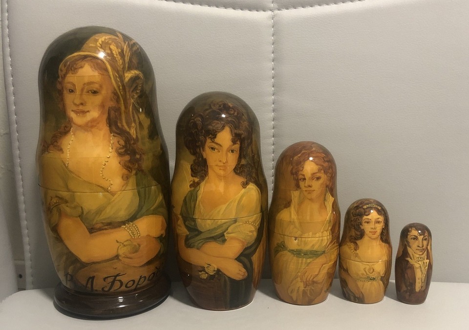 There are Russia folk craft in which images from famous paintings, including portraits by Vladimir Borovikovsky, are used to decorate traditional Russian nesting dolls. Matryoshka dolls in this style are made by applied artists( in this case Artist Minakova N. B the city of Ryazan ) inspired by classical Russian painting, including Borovikovsky's works, such as this set include 5 matryoshkas with paintings of (from biggest to smallest):