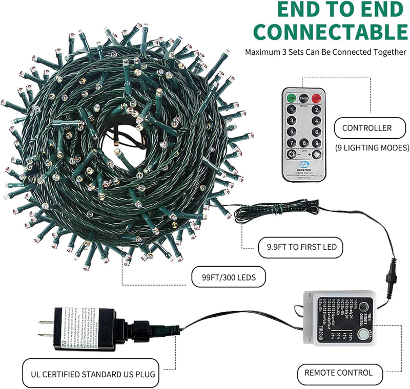 End To End Connectable: Each fairy light comes with an end-to-end plug, which makes you can connect max 3 sets together. Each one length is 108 feet with 300 LEDS, the max expandable length is 324 feet with 900 LEDS.