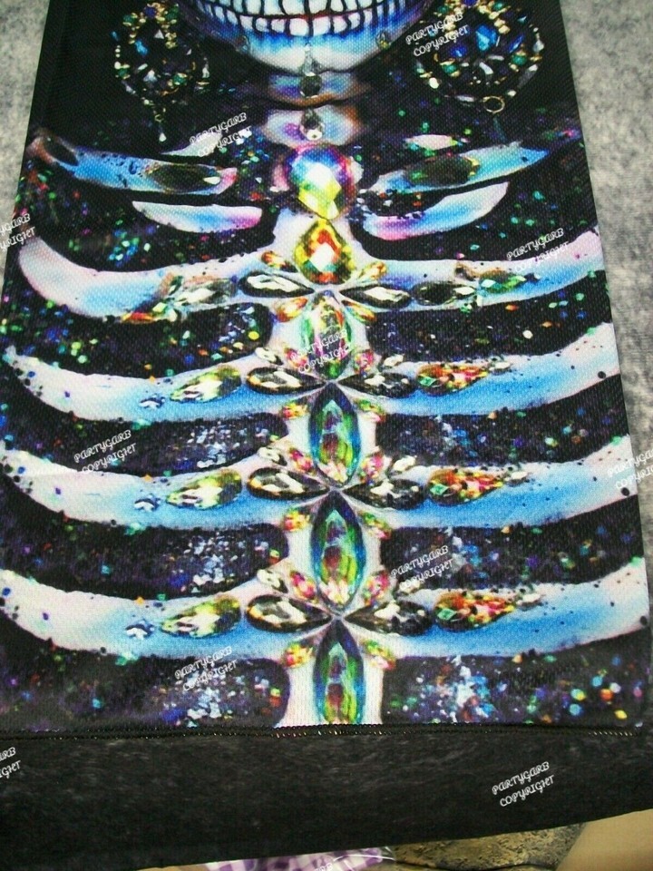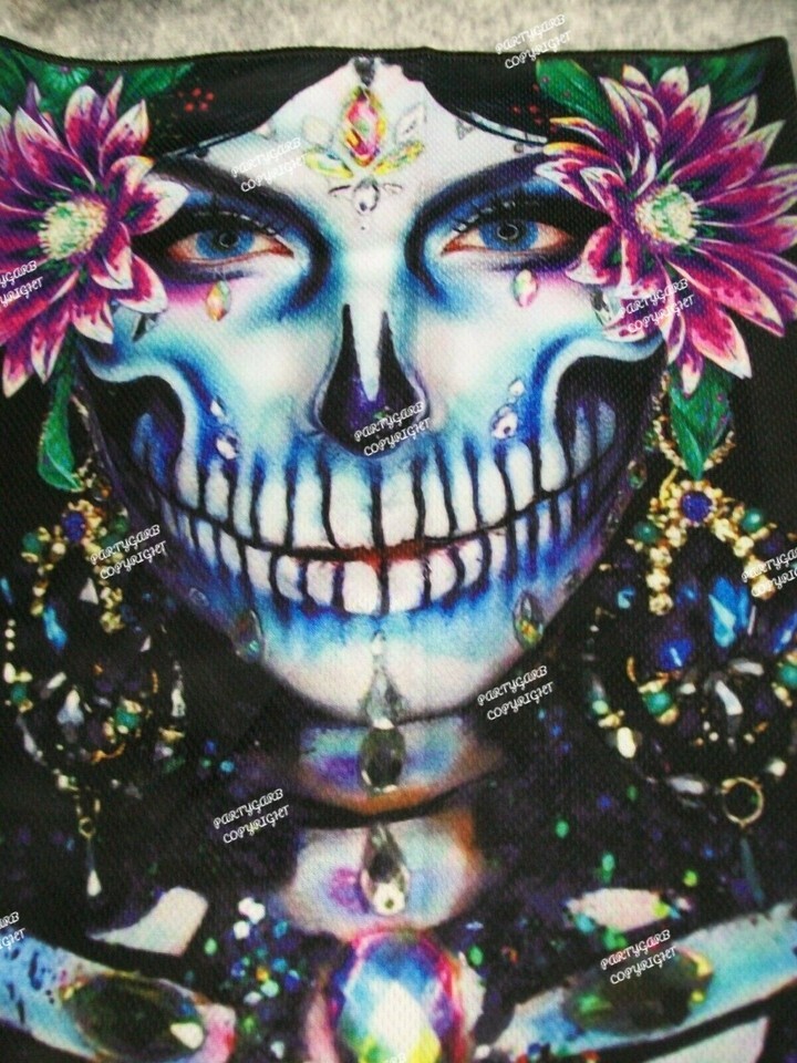 Multicolor Cloth Thin Lightweight Fabric with Print. Jeweled Skeleton Face Print. May need to fold down fabric to line up with your nose or facial features, if necessary. Seams have some slight puckering around the stitching. One Size Fits Most Adults. Great costume accessory for: Senorita, Day of the Dead, Anime, Cosplay, etc.