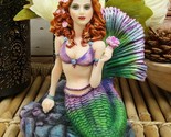 ? This beautiful mermaid wants to be your BFF! She is based upon the artwork of Brigid Ashwood. The sultry siren has red hair dotted with pink flowers, and she holds another rose bloom stalk. Her scales are done in shades of purple, blue, and green, and she reclines on some iridescent rocks. A unique and eye-catching addition to your nautical or fantasy decor!