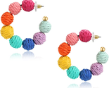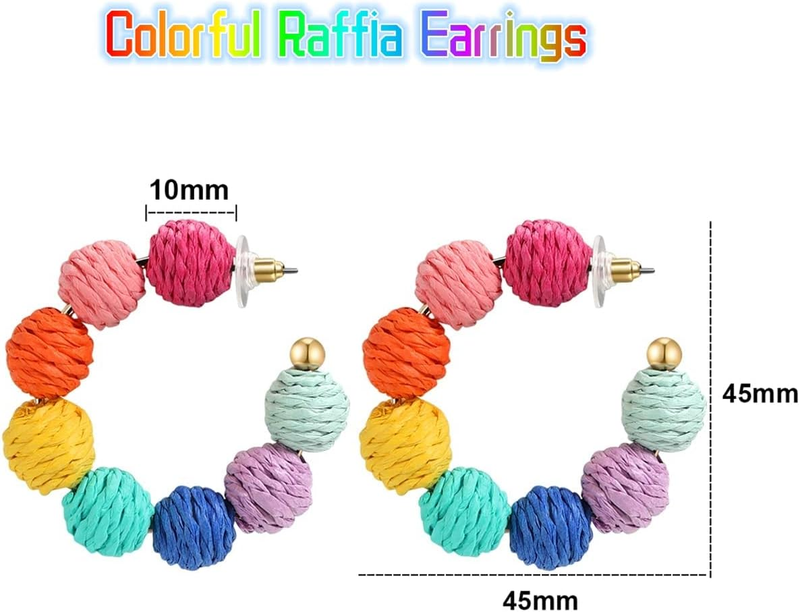 Our Raffia Earrings are made of 8 pcs rainbow color hot pink/pink/orange/yellow/green/royal blue/purple/light blue raffia ball beaded create a classic hoop, exudes a bohemian beach vibe, add a bright color to your summer outfit;