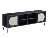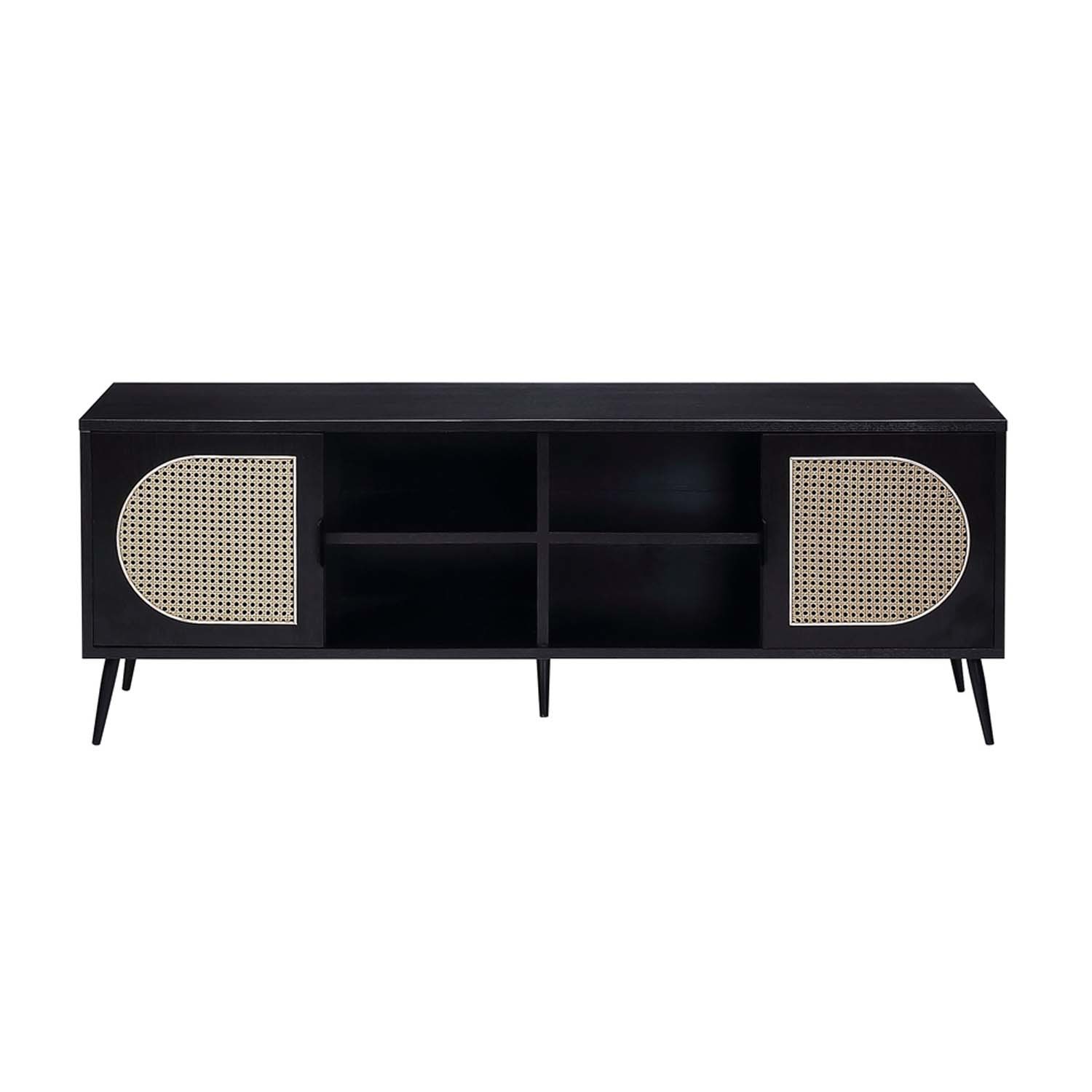 This Colson TV stand is the perfect addition to your home. The black finish matches any decor and gives your space a modern feel. It has rattan door front inserts, giving it a light and airy feeling. The legs are tapered, for a modern flare. Featuring four open compartments that provide easy access to all of your media devices at once so you can easily change batteries or other components without having to move anything out of place.