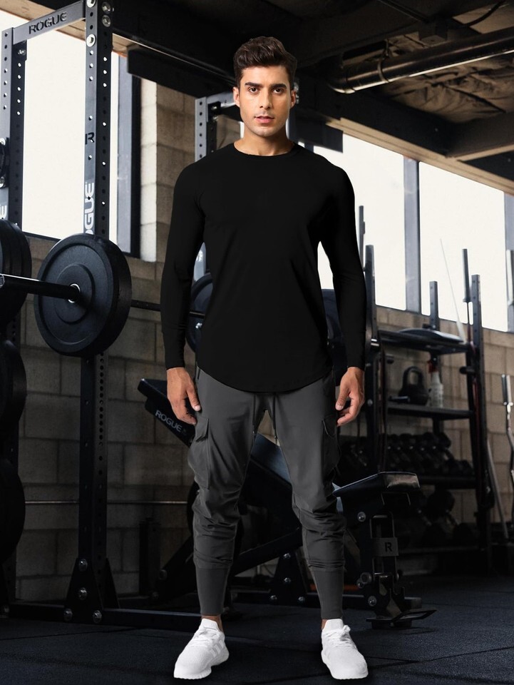Stylish and Functional: Features a trendy curve hem and a relaxed fit, Our men's long sleeve athletic shirt blends casual style with gym-ready performance.