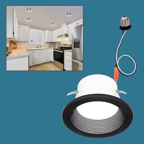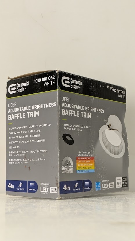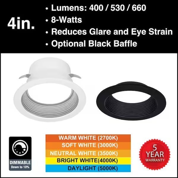 Create eye-friendly diffused lighting with this 5in/6in. Commercial Electric Low-Glare Integrated LED Recessed Light. The White and Black baffles have a ribbed interior which absorbs light to reduce glare and eye strain; ideal for people who are sensitive to bright lights. Prior to installation, select desired white light between Warm White to Daylight and brightness levels offering a variety of light settings right at your fingertips. With its wet location rating, this light can be installed in a bathroom, shower, sunroom, covered patio or deck and much more. Our LED Deep Baffle light fixture provides long-lasting service and is maintenance free with no bulbs to replace.