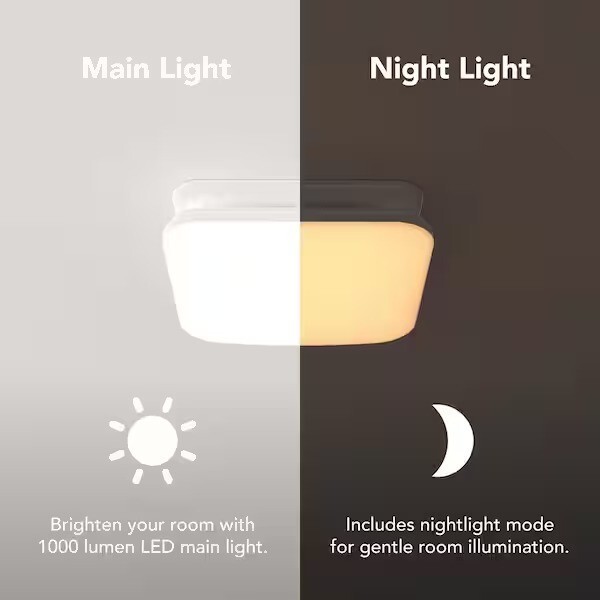 High-performance LEDs produce 1,500 lumens with main light, 100 lumens night light controlled by wall switch