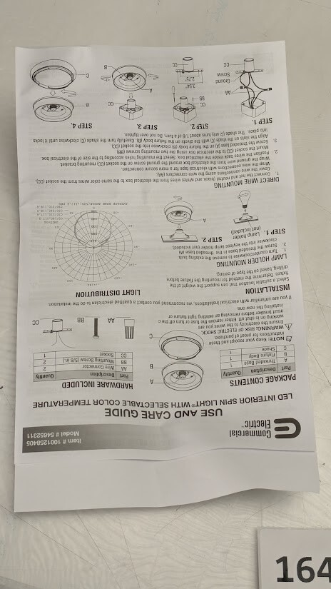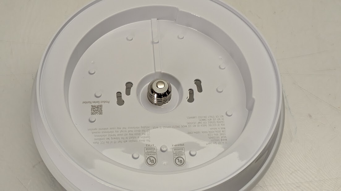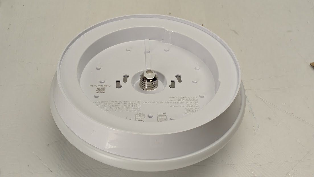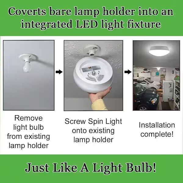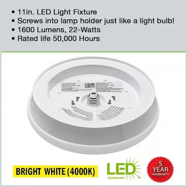 Commercial Electric Spin Light 11in. LED Flush Mount replaces outdated incandescent bulbs with a crystal-clear energy-efficient LED light fixture. Our Spin Light is designed to simply screw into most existing plastic and porcelain E26 Medium base lamp holders without any wiring required. *Direct wire option is available using E26 Adapter included in box. It emits 1600 Lumens of brightness using only 22-Watts of energy saving electricity, the environment and your wallet. Great for closets, bathrooms, stairways, basement, garage, attic or laundry room.