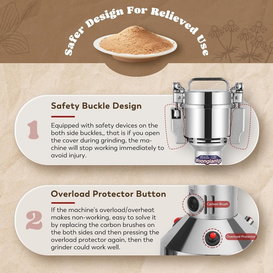 Experience the power and precision of our 850W Grain and Spice Grinder, a true powerhouse that allows you to pulverize a wide array of dried materials with breathtaking efficiency.