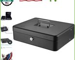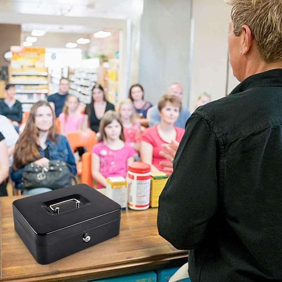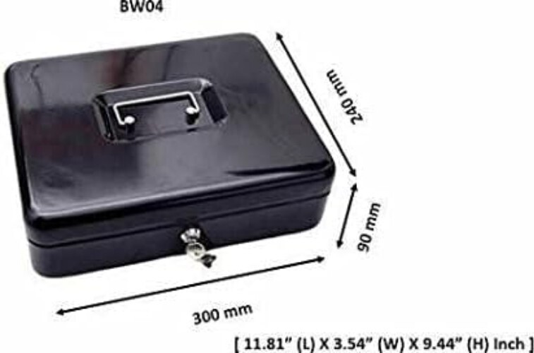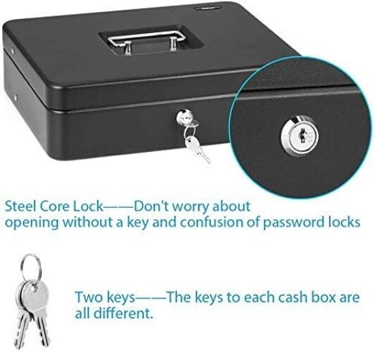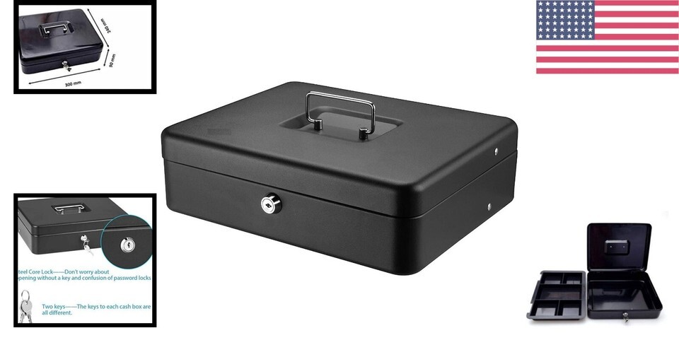 - Compact Black Money Saving Box with Cash Tray & Key Lock, 3.75 x 12 x 9.3 in