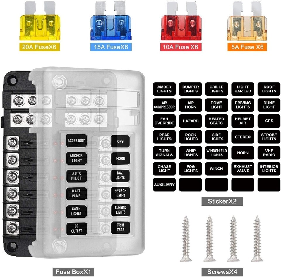 ? Package Contents: Includes 1 x 12-Way Blade Fuse Block with Protection Cover, 6 x 20A Fuse, 6 x 15A Fuse, 6 x 10A Fuse, 6 x 5A Fuse, 4 x Screws, and 2 x Stickers.