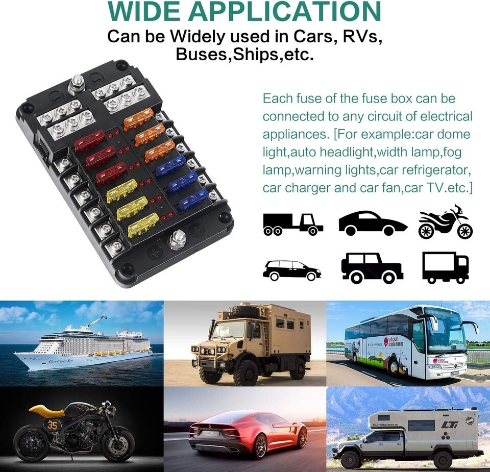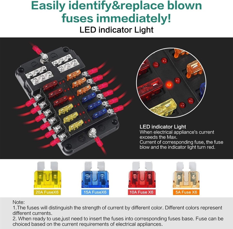 Features: Waterproof,Optimal Conductivity,LED Safety Indicator,Splash Protection,Dust Prevention,Heat Resistant,Flame Resistant,Easy to Identify Appliances,Easy to Replace Fuses,Multiple Circuits,Includes Screws,6 Fuses of 20A,6 Fuses of 15A,6 Fuses of 10A,6 Fuses of 5A,12-Circuit Blade Fuse Box,Positive Negative Terminals,Mechanical Strength,Insulated Fuse Holder,Click-lock Protective Cover,Push Latch System,Safe Easy Operation