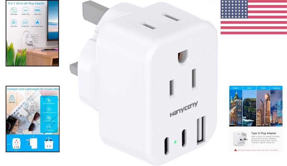- Compact UK Ireland Travel Adapter with 2 USB-C Ports & 3 USB for Fast Charging