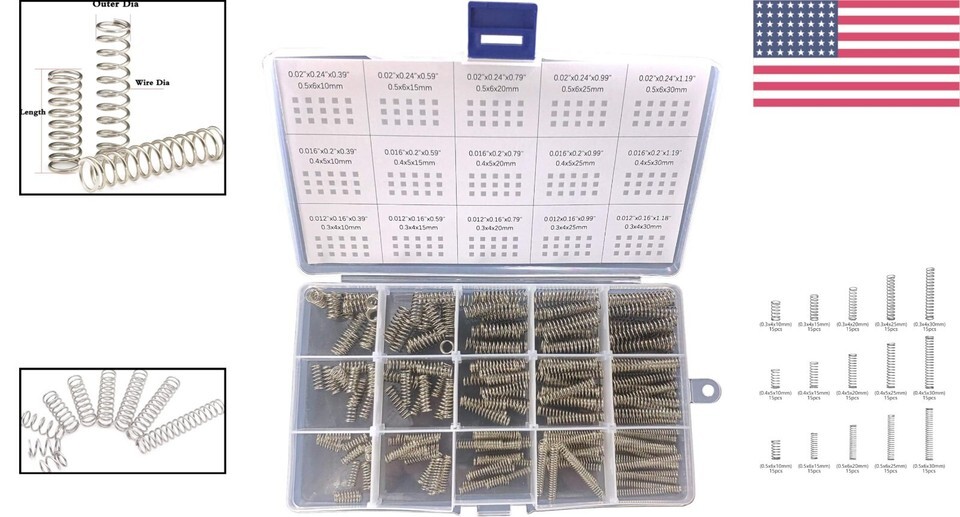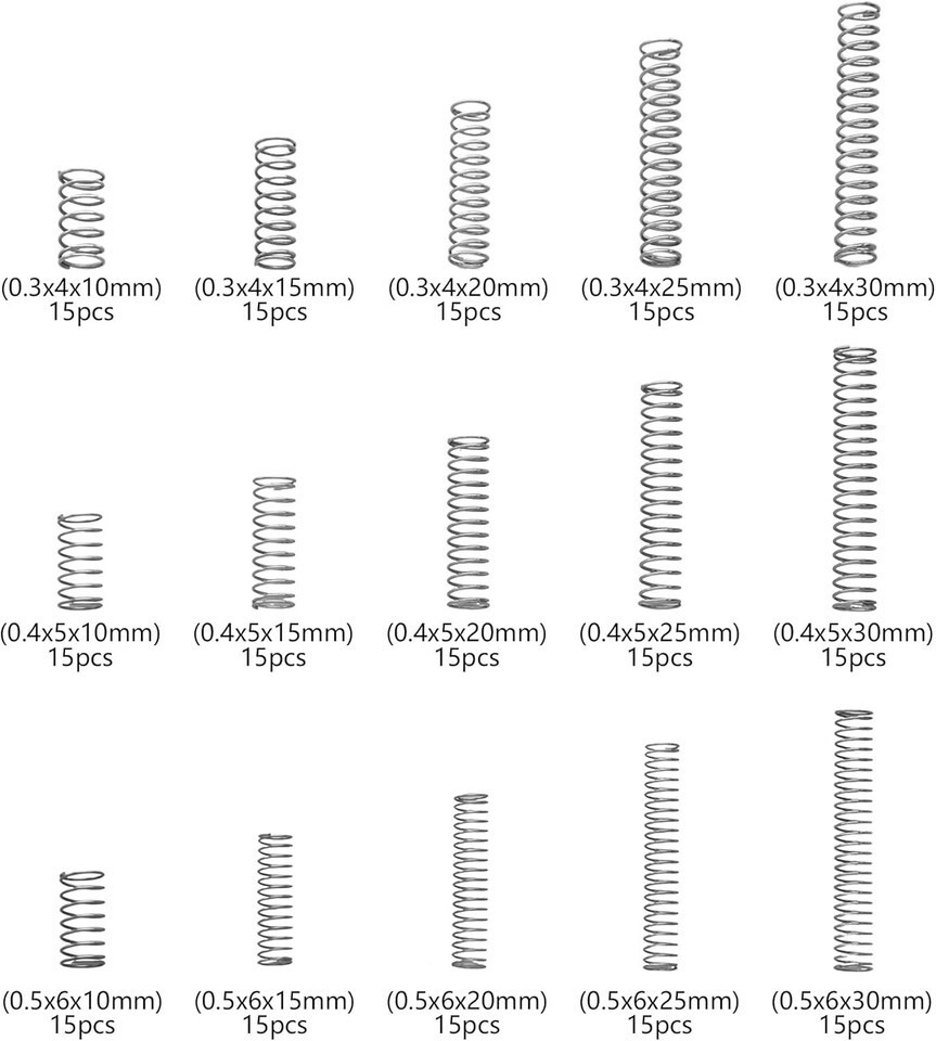 - Complete 225pcs Mini Stainless Steel Compression Springs - 15 Sizes Included