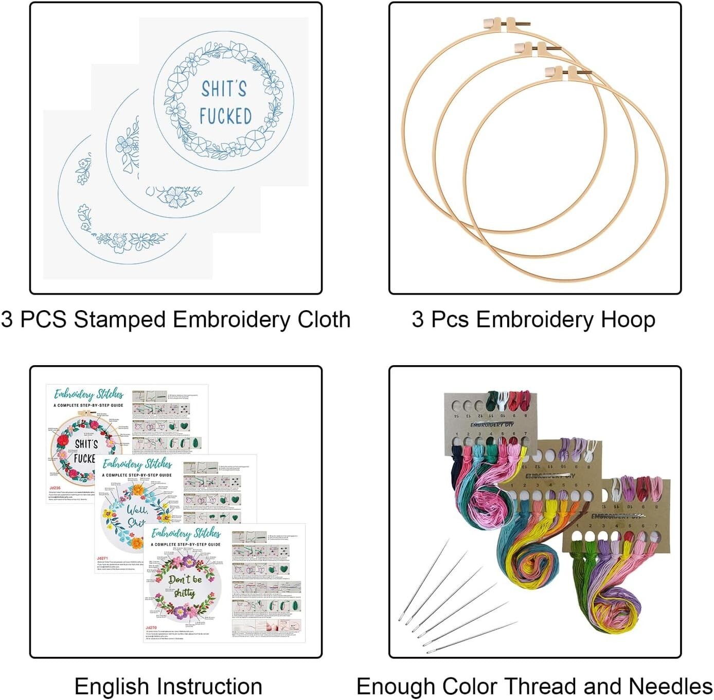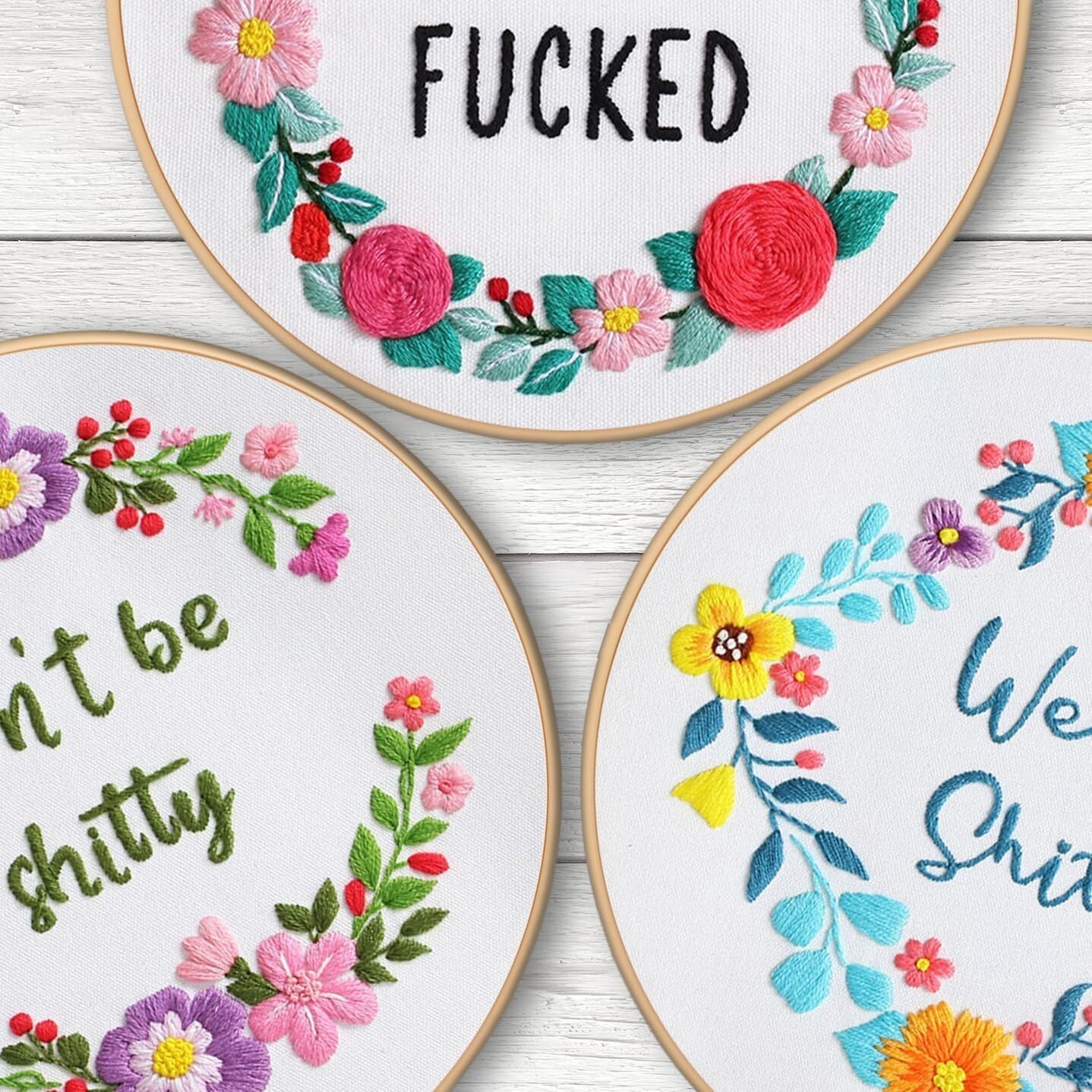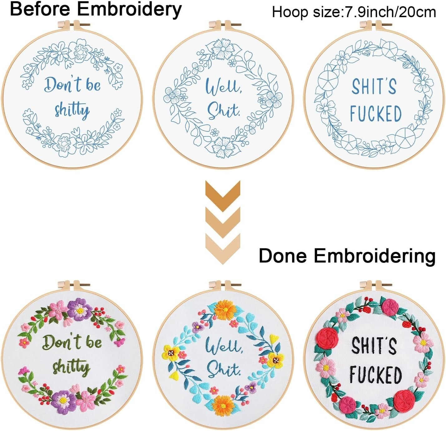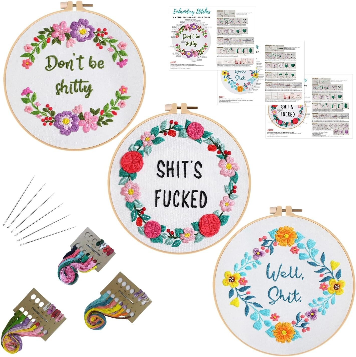 Features: With Frame,Funny words pattern,Floral wreath,Embroidery instructions,Illustrated instructions,Printed pattern,Water-soluble ink,3 sets included