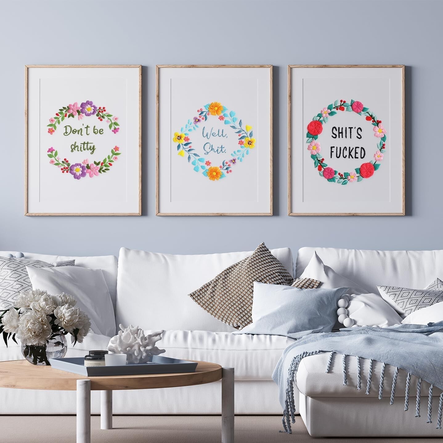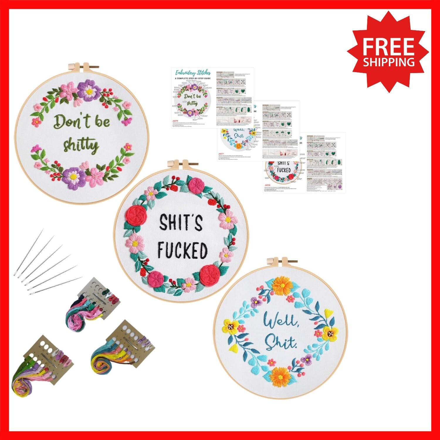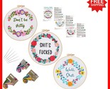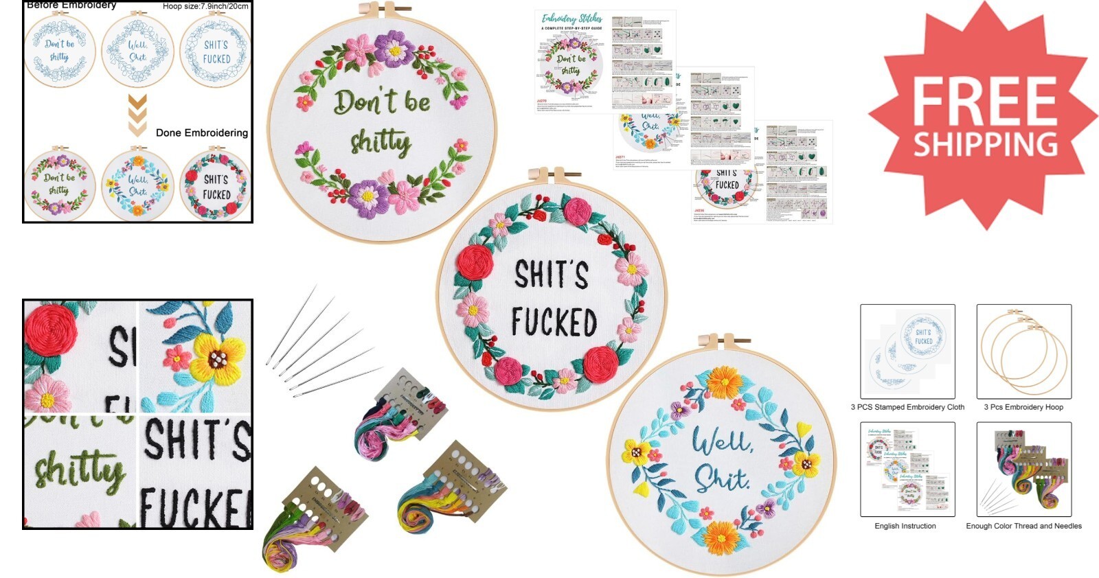 Features: With Frame,Funny words pattern,Floral wreath,Embroidery instructions,Illustrated instructions,Printed pattern,Water-soluble ink,3 sets included