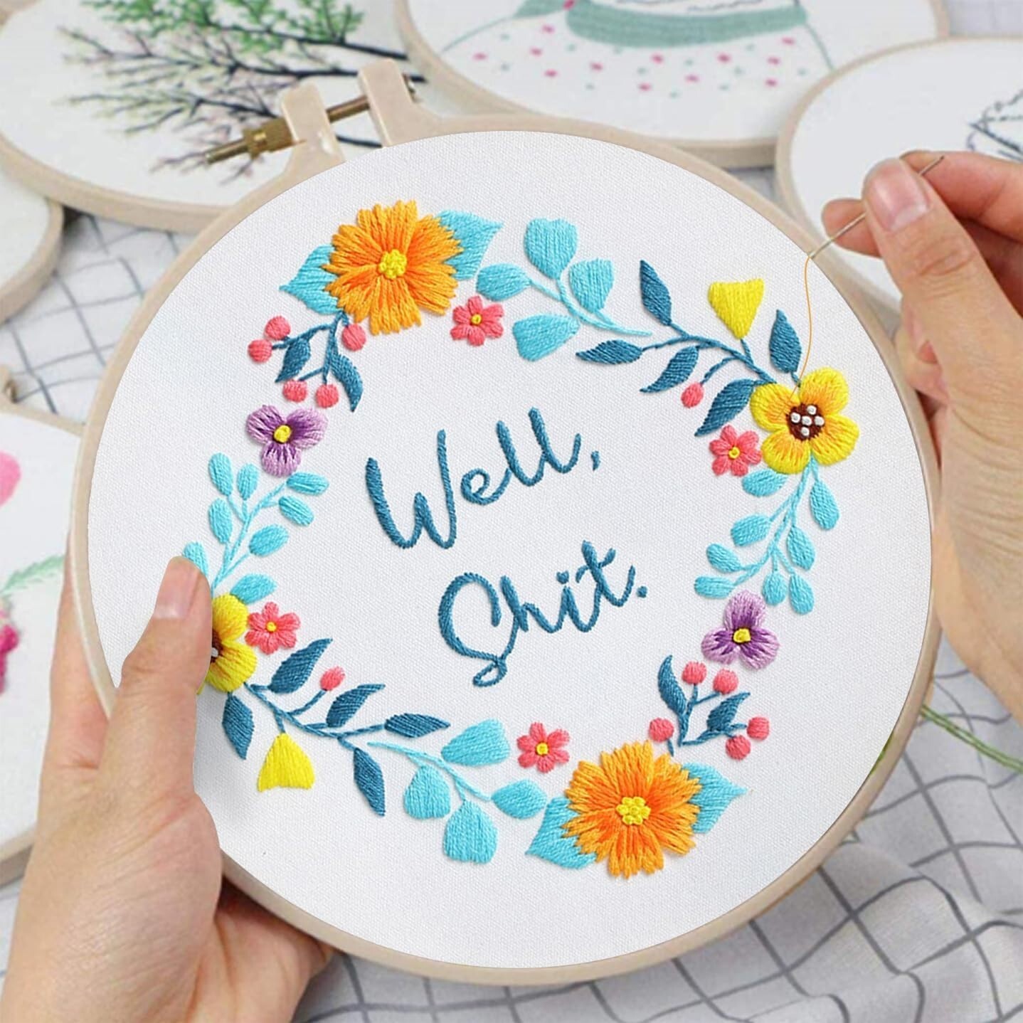 Discover the perfect starter embroidery kit featuring adorable floral wreaths and humorous words to inspire beginners. This comprehensive set includes three embroidery cloths with water-soluble ink patterns, three 7.9-inch embroidery hoops, six needles, colorful threads, and detailed instructions with illustrations to guide you. Whether for personal enjoyment or as a thoughtful gift, this kit offers endless creative possibilities?hang your finished work or personalize everyday items like pillowcases, towels, and clothing. Unleash your creativity with this delightful embroidery set!