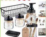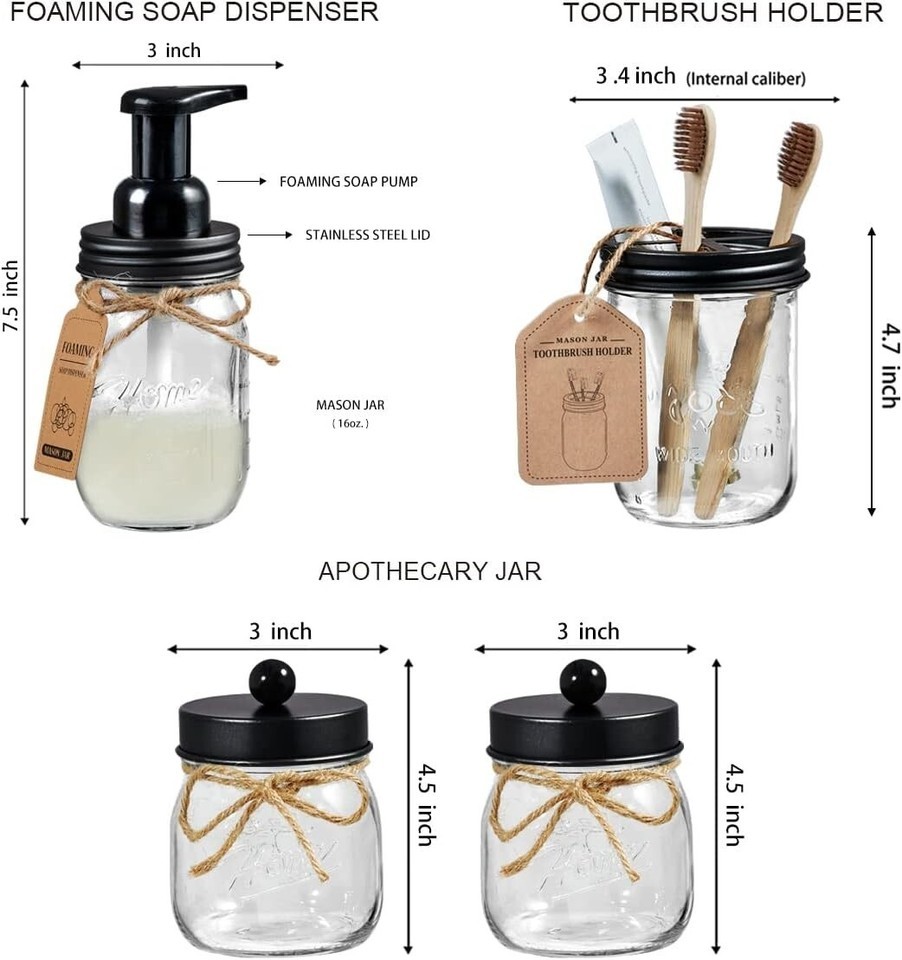Q-Tip Holder Soap Dish: The mason jar Q-tip holder organizes cotton balls, flossers, and more, while the chic black metal soap dish adds a stylish yet durable component to your decor.