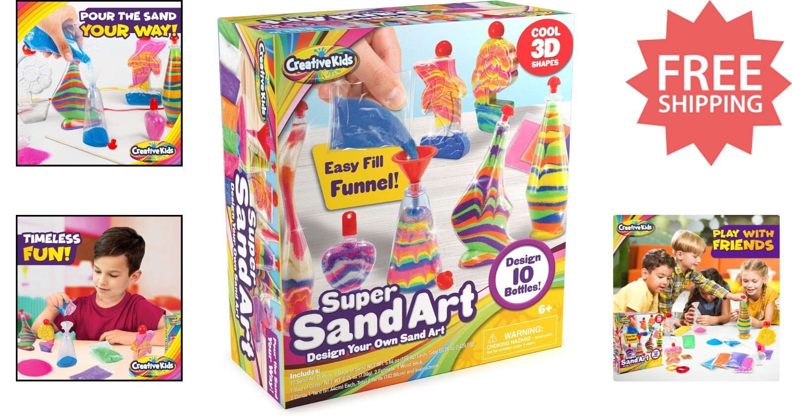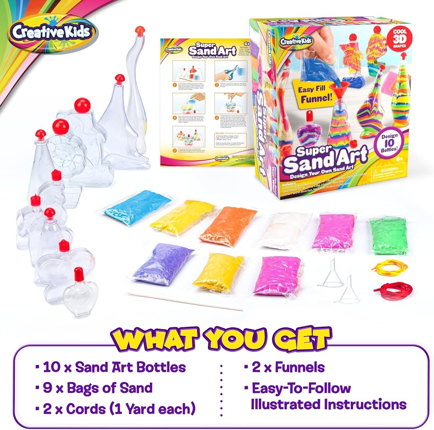 Unleash your child's creativity with our all-in-one Super Sand Art Activity Set, perfect for creating stunning DIY rainbow sand masterpieces at home, school, or on the go. This comprehensive kit includes 10 empty sand bottles, 9 vibrant 175g colored sand bags, glitter sand, and a no-mess funnel?everything little artists need to design incredible art projects. A fantastic STEM toy that promotes essential skills and sparks imagination for hours of educational fun. Ideal as a unique gift for children of all ages, making it a perfect present for holidays, birthdays, or special occasions.