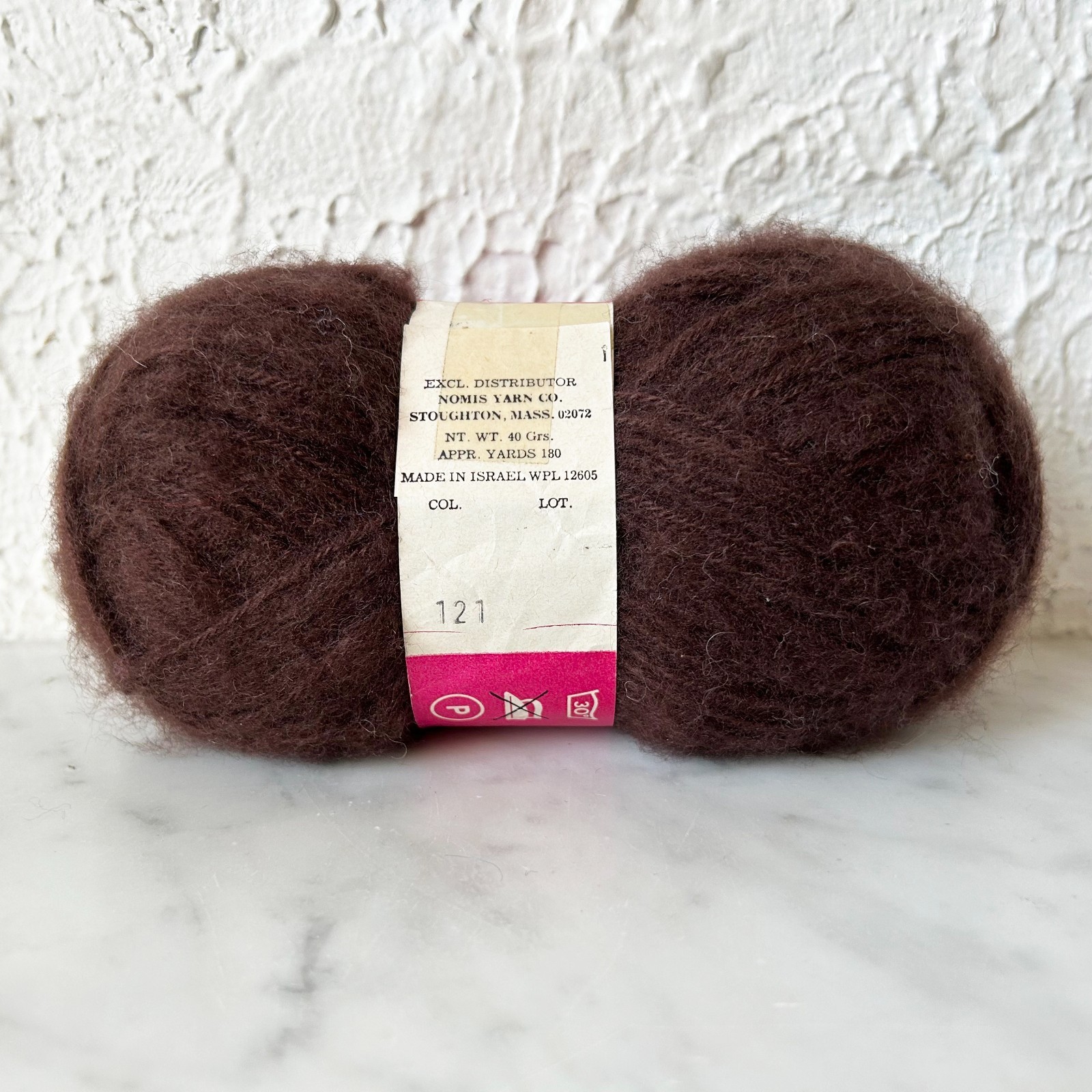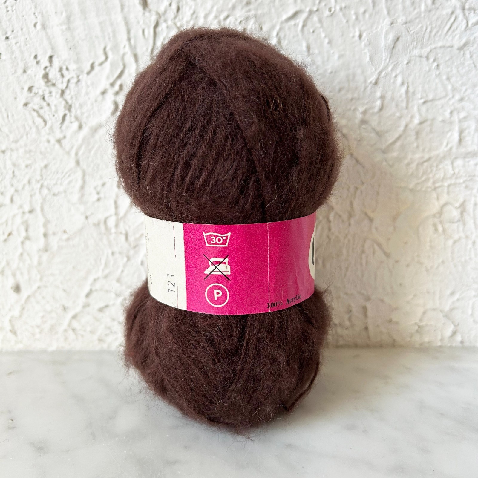 One skein of Conny brushed yarn. Color Dark Brown #121. 100% Acrylic. Hand wash, dry flat. Made in Israel.