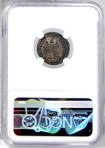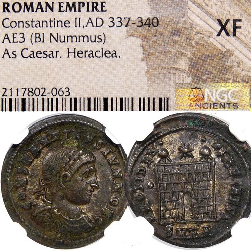 - Constantine II Son of "the Great" NGC Cert. XF. Silvered Campgate AE3 Roman Coin