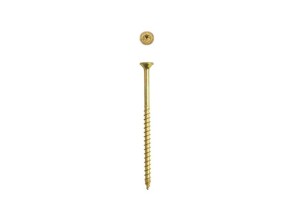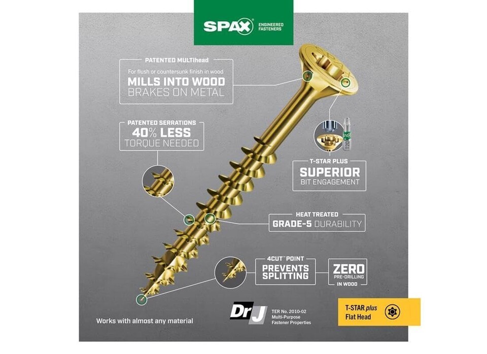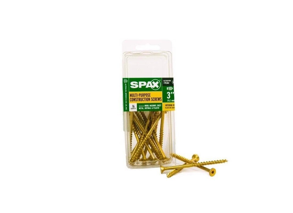 The SPAX factor - for the craftsman that concentrates on the details, we work for you. For the pro that puts qualify first, we help you create stronger connections, enhance performance and improve results when your reputation is on the line. This high performance wood screw is not your average screw. While it is designed for wood applications it is also functional for other materials like masonry, drywall, plastic and up to 24ga steel. Masonry and concrete do require pre-drilling. It is made with carbon steel and coated for durability to fasten strongly and securely. U.S made SPAX is your trusted partner for your fastening needs. Do it Once, Do it Right with SPAX.; ; Brand Name: SPAX Sub Brand: Multi-Material Callout Size: No. 10 in. Length: 3 in. Drive Style: T-20+ Head Type: Flat Head Product Type: Construction Screws Number in Package: 16 pk Driver Bit Included: No Color: Yellow Indoor or Outdoor: Indoor Self Drilling: No Grade: 5 Grade Finish: Yellow Zinc Packaging Type: Clamshell Thread Type: Serrated Application: Multi-Purpose Material: Carbon Steel Self Tapping: Yes Head Size: 0.390 in. Thread Style: Partially Threaded Thread Diameter: 5/32 in. Thread Length: 1.600 in.