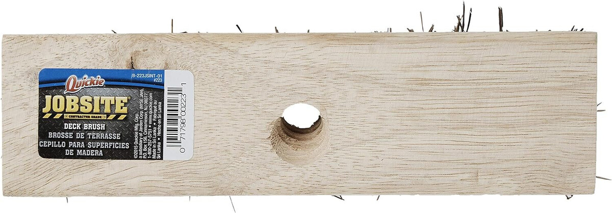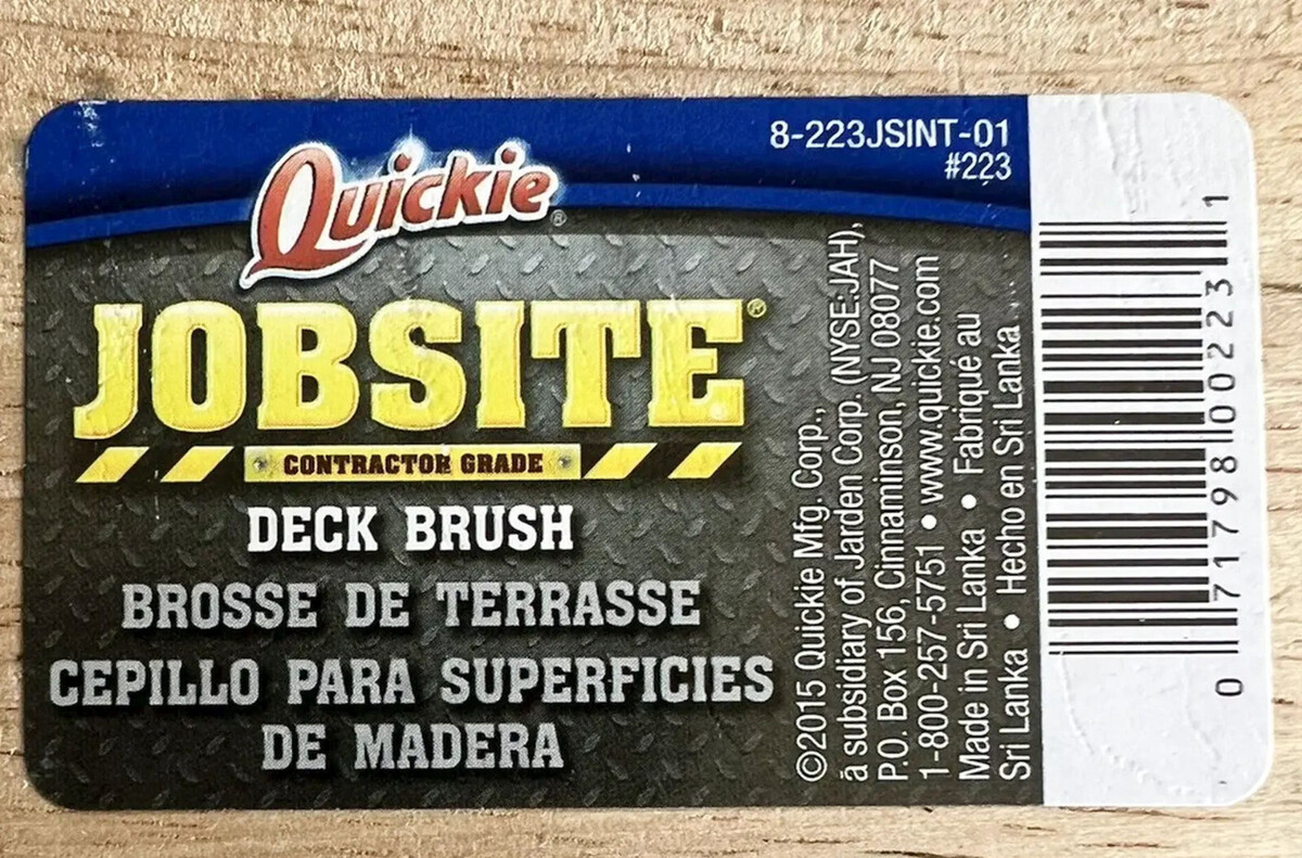 (1) NEW QUICKIE JOBSITE DECK BRUSH MANUFACTURED BY QUICKIE MANUFACTURING COMPANY MPN #233 or 8-223JSINT-01 UPC# 071798002231. THIS IS A CONTRACTOR GRADE NATURAL FIBER BLEND STIFFFFF BRUSH FOR SERIOUS CLEANING AND HARD SCRUBBING. FOR SCRUBBING BRICK, CONCRETE, WOOD, PATIO, DECK, AROUND THE POOL DECK, CLEAN YOUR PATIO OR CHIMNEY EXTERIOR, ETC, WHERE MORE CLEANING HORSEPOWER IS REQUIRED. STIFFY TOUGH AND HARD NATURAL FIBER BLEND BRISTLES ARE 1" tall, ON 9" x 2 1/2" REAL WOOD BLOCK, IN A TRADITIONAL UNION MIX, AND PROVIDE AMPLE SCRUBBING POWER. A THREADED POLE IS REQUIRED (standard threaded paint or mop pole), NOT INCLUDED IN THIS SALE. YOU WILL RECEIVE ONE (1)