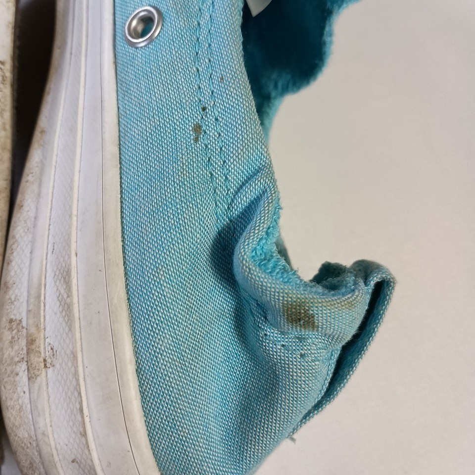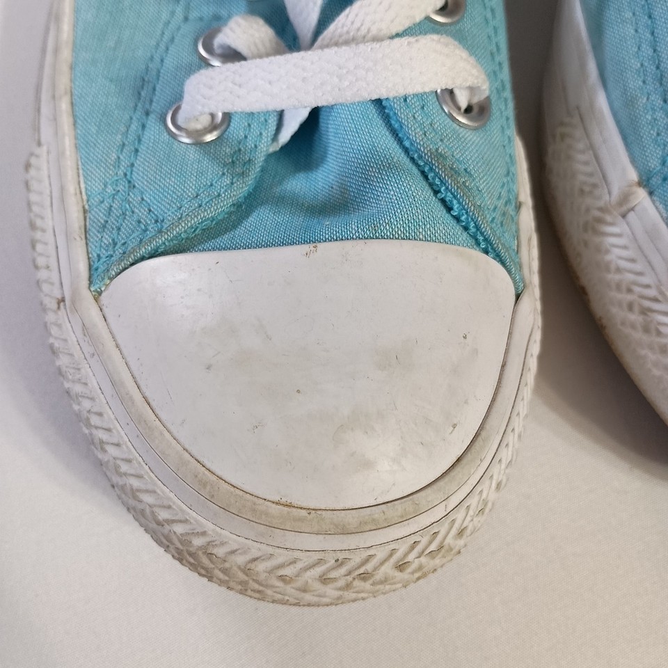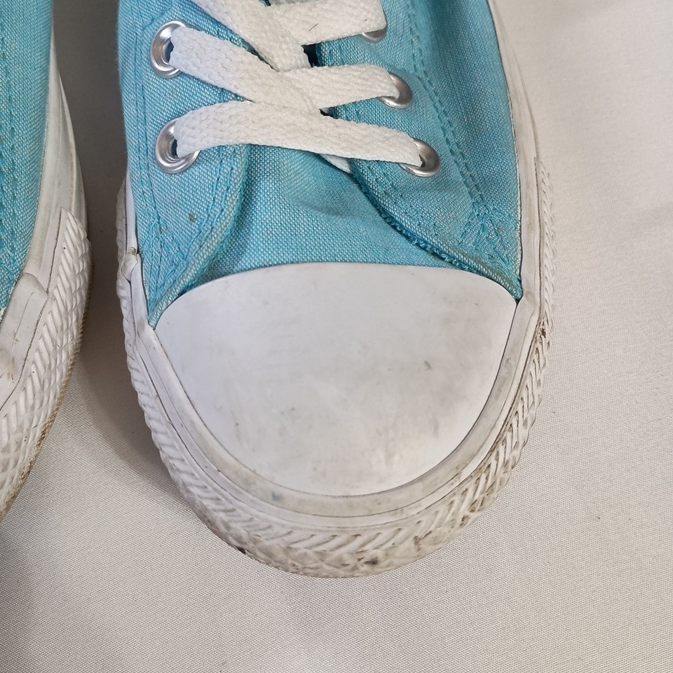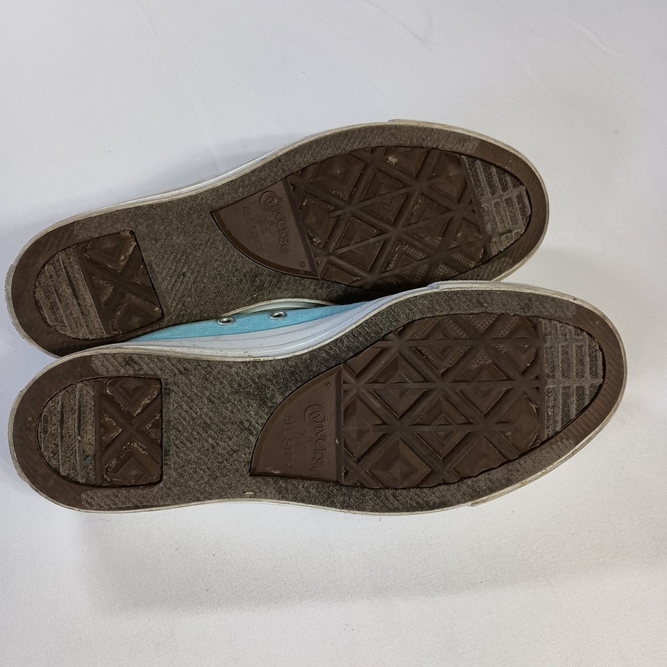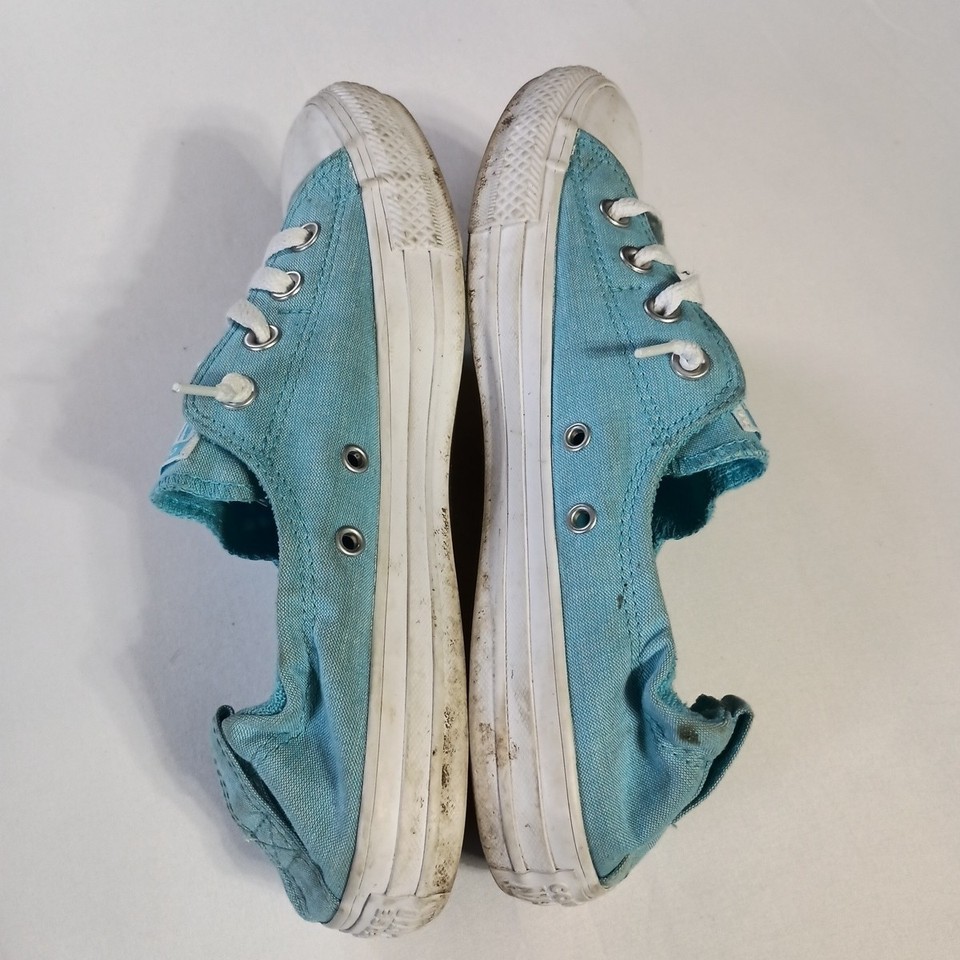 The product is a pair of Converse All Star shoes in a blue ankle slip-on style, specifically designed for active women in size 9.5. These sneakers are made with a canvas upper, textile lining, and feature a solid pattern. With a classic Converse brand and athletic design, these shoes are suitable for various occasions including activewear, casual wear, and workwear. The slip-on style and elastic fitting ensure comfortable wear for everyday activities. Normal wear.