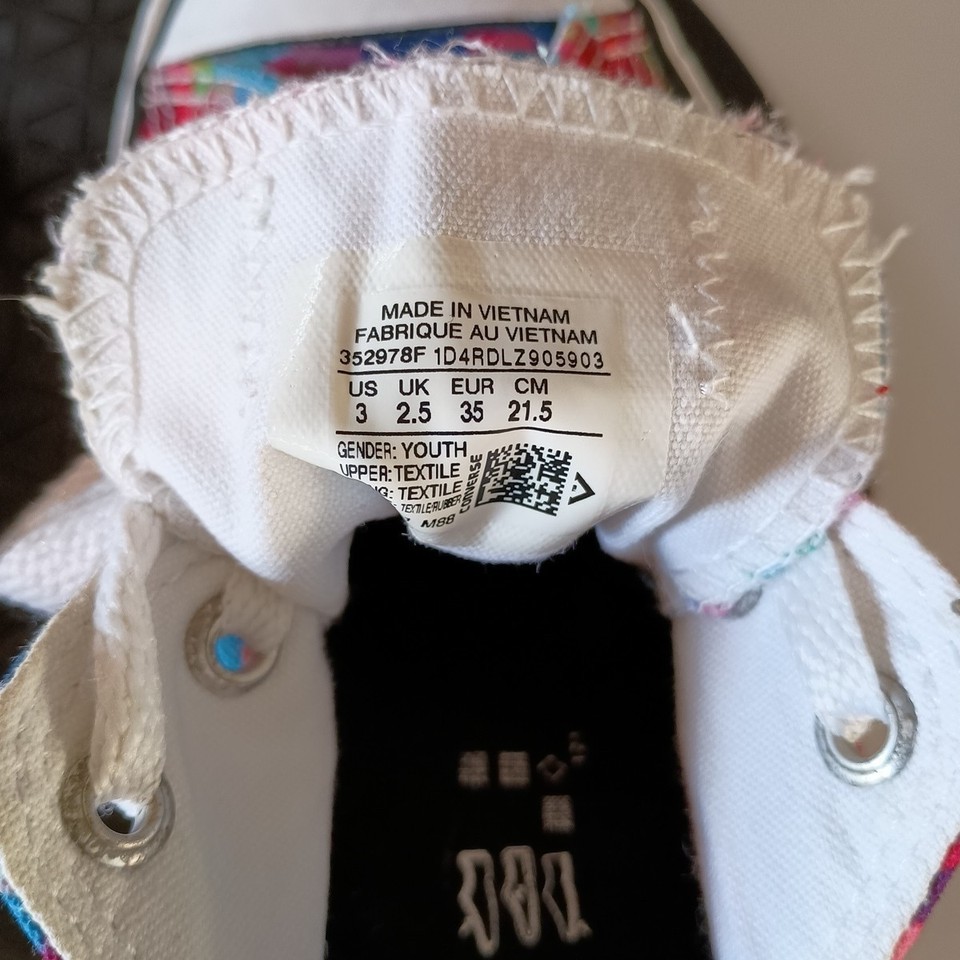 The Converse All Star Youth Size 3 Multi-Colors Lace Up Low Top Sneakers #352978F is a stylish and comfortable option for young girls. Featuring a low top design and lace-up closure, these sneakers are perfect for casual occasions like walking. The multicolor upper material and textile lining add a fun touch to the classic Converse All Star style, making them a great choice for everyday wear. With a durable rubber outsole and textile upper material, these sneakers combine fashion and functionality. Normal wear. See pictures.
