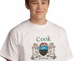 Product description: Cook Irish Coat of Arms Tee Shirt in White. Every Irish family has a story to tell, probably hundreds of stories. Your Irish coat of arms is a visual record of your family's oldest, most significant stories. Here, they're told in bright, permanent artwork on these fine-quality, 100% cotton Gildan tee shirts. Over 25 years of heraldry research and over 1000 available Irish family coat of arms.