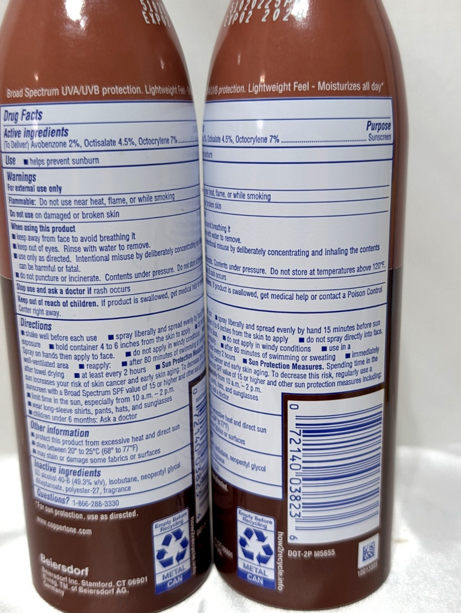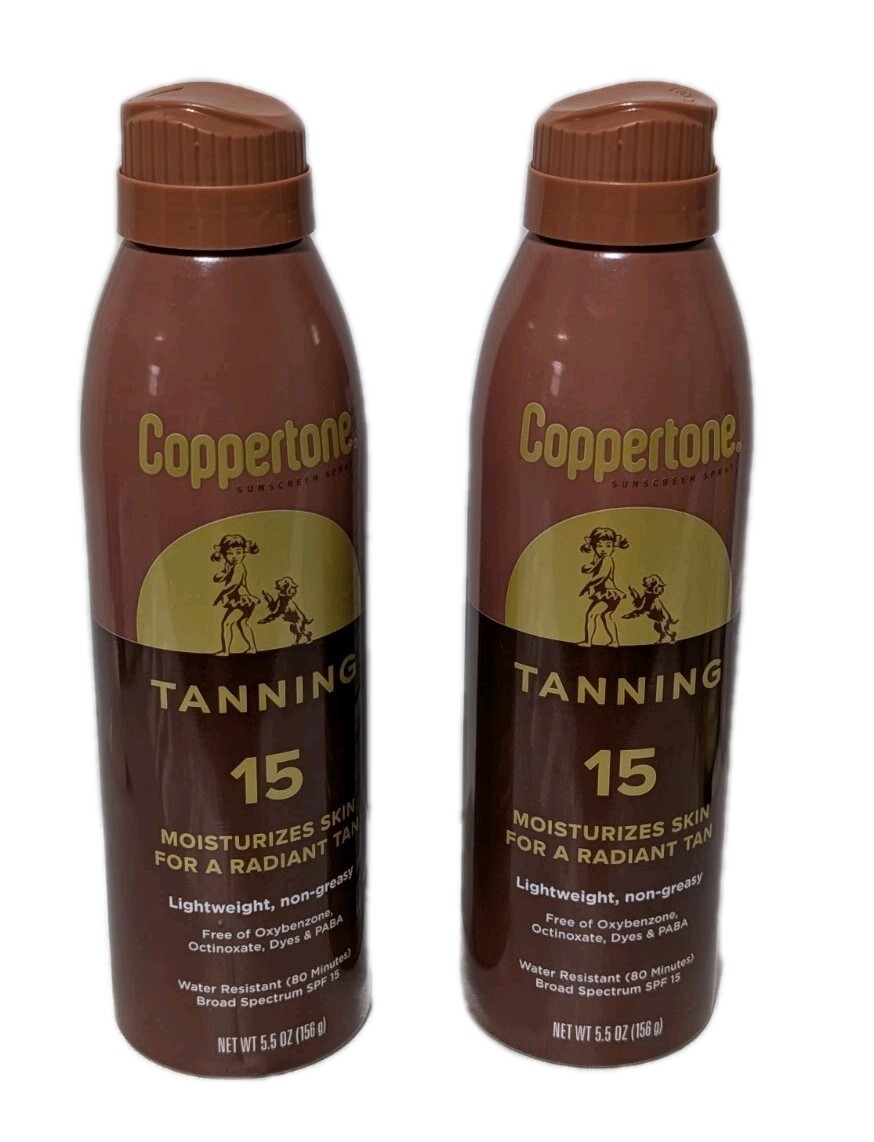 - Coppertone Tanning Sunscreen SPF 15 Spray 2x Family Size 8.3oz ea Exp. 2/28