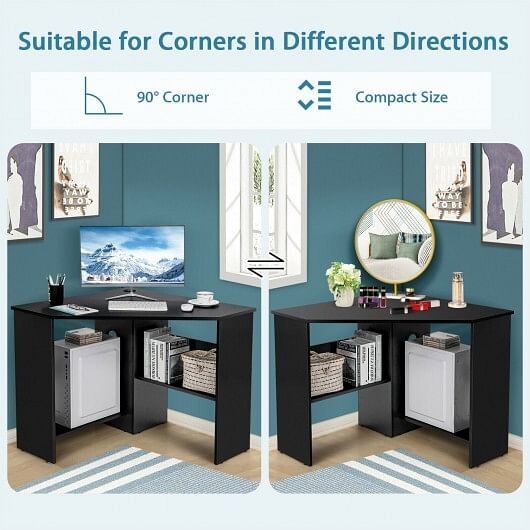 - Corner Computer Desk Triangle Writing Workstation with Storage Shelf-Black - Col