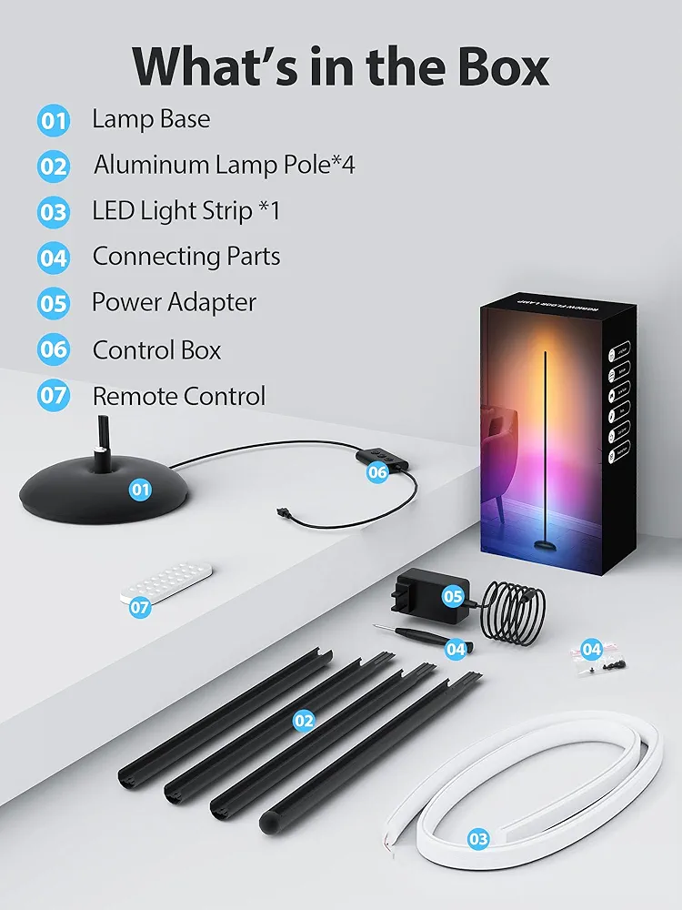 Complete Package Lifetime Warranty: Your purchase includes: smart floor lamp (with 4 aluminum poles, stable base, and silicone light strip), remote control, power adapter, user manual, and installation guide. Plus, we stand behind our product with a lifetime warranty, so if you have any questions or concerns, our customer support team is here to help.