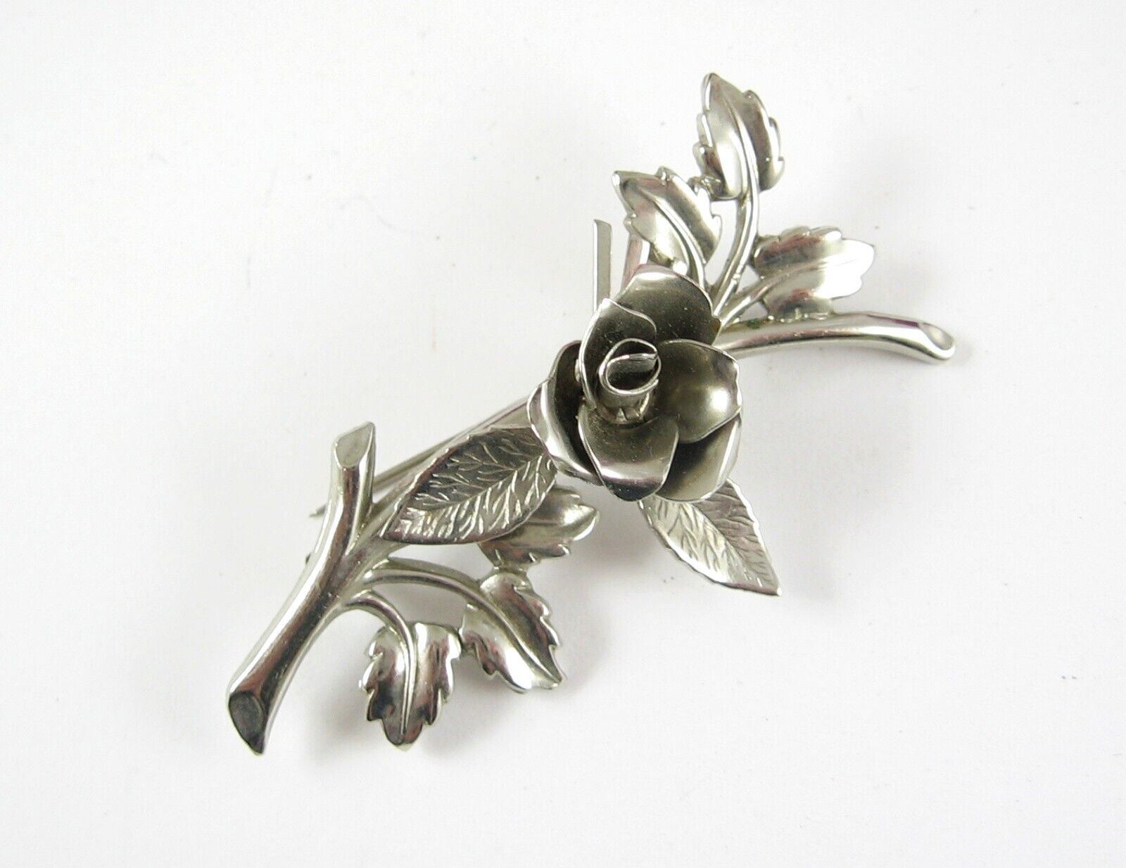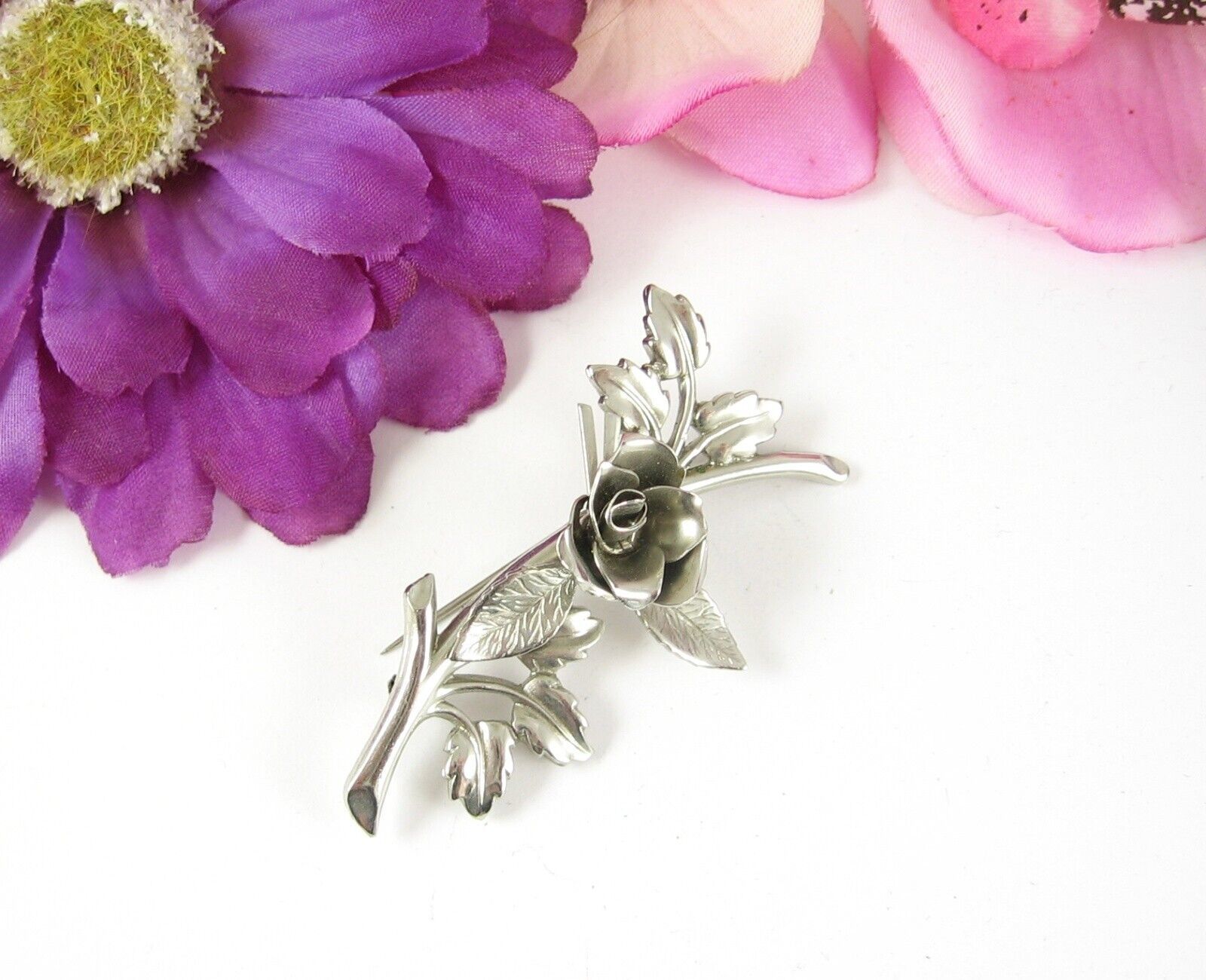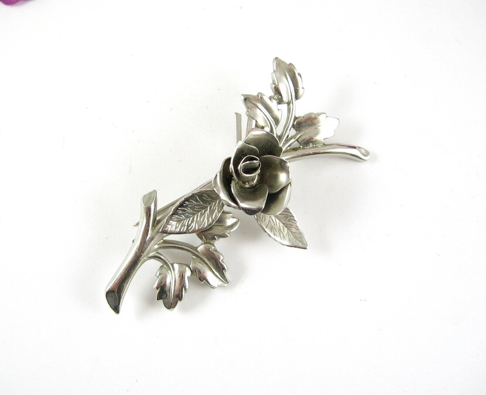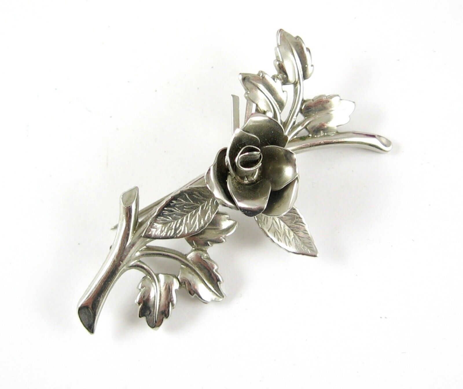 - CORO Pegasus Vintage ROSE BLOOM BROOCH Branch Flower Leaves Silvertone 2 1/2"