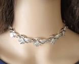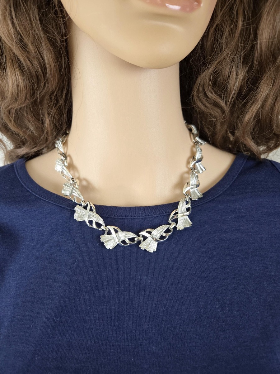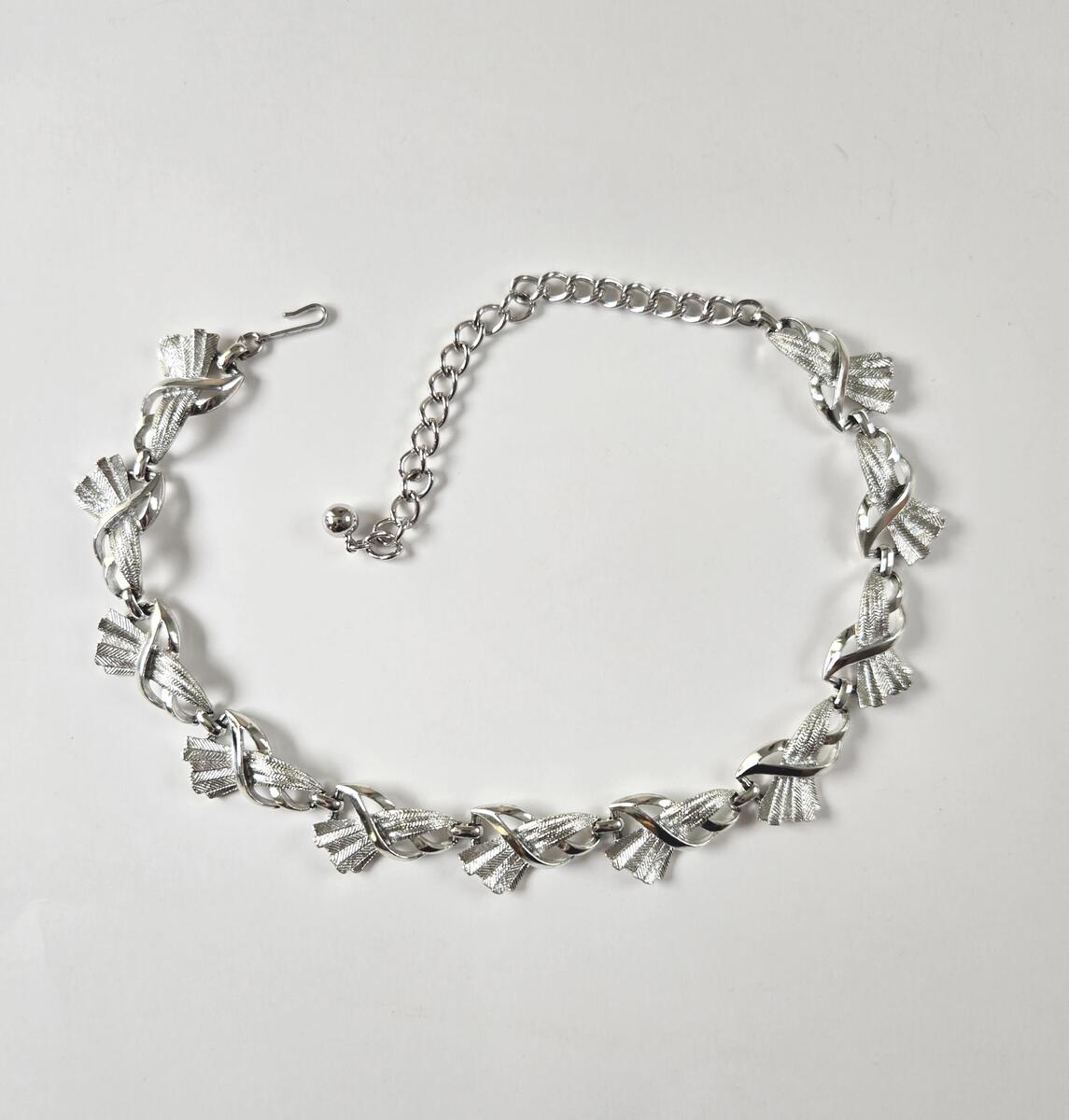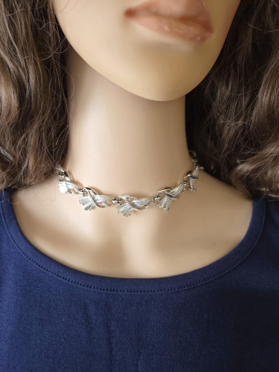 ?Style/Features: This exquisite 1960s choker necklace captures the mod era's sculptural flair with it's rhodium plated finish and intricate twisted metal links forming a fan-like leaf motif that drape elegantly around the neck. Each interlocking link adds texture and movement making it a versatile statement piece for bohemian, minimalist or vintage inspired looks. The extension chain allows it to be worn from 14-17 inches.