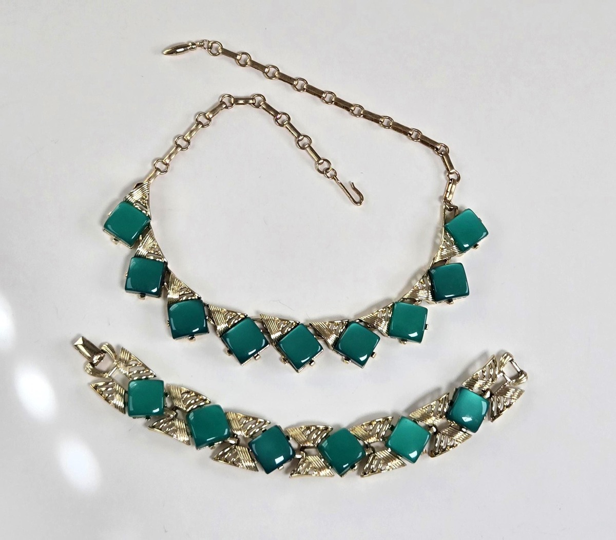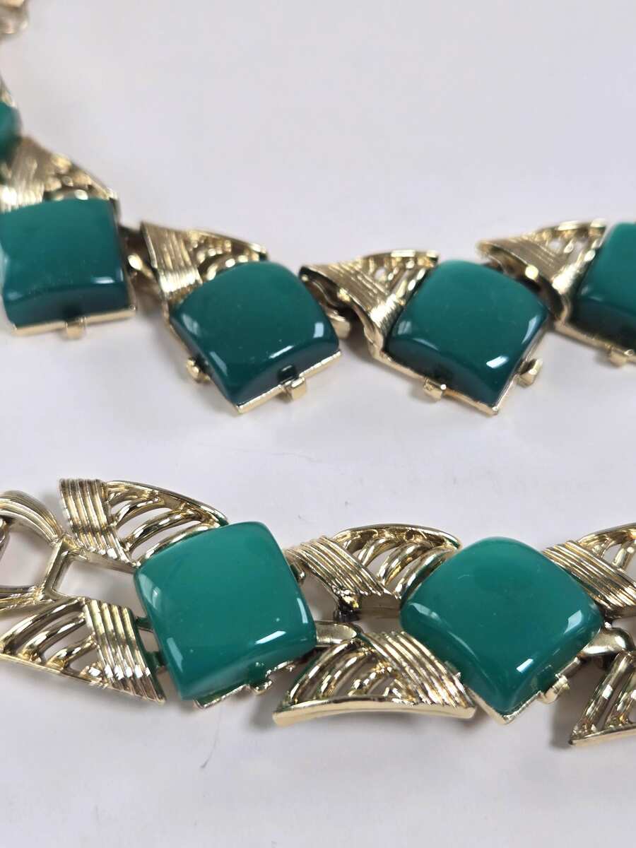 - Coro Thermoset Jewelry Set | Emerald Green Choker Necklace & Bracelet | 1950s Mi