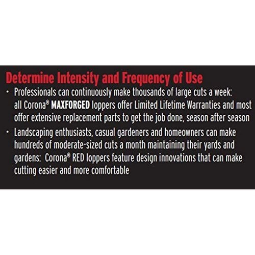 Powerfully designed and made with MAXFORGEDTM steel, the 33-inch Corona DualLINK? Forged Bypass Lopper is the branch cutter of choice for professional landscapers and arborists. With a power-compounding link feature, these loppers cut green or dry branches up to 2-inches in diameter and let you do 35% more work with less effort than a traditional tree pruner. Contoured handle grips and a shock-absorbing bumper let you comfortably use this tree trimmer through long days of work, while its durable steel blades stay sharp cut after cut.