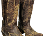 Brown Crackle Cowhide Foot Upper. 10" Upper w/ Pull Straps. Gold Stitched Winged Cross Design on Foot Front Back of Upper. Gold Stitched Wing Design on Heel Counter. Soft Leather Lining. Snip Toe style. Cushioned Insole. Leather Outsole. 1 3/4" Lightly Cushioned Riding Heel. Single Stitched Welt.