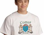 Product description: Cotter Irish Coat of Arms Tee Shirt in White. Every Irish family has a story to tell, probably hundreds of stories. Your Irish coat of arms is a visual record of your family's oldest, most significant stories. Here, they're told in bright, permanent artwork on these fine-quality, 100% cotton Gildan tee shirts. Over 25 years of heraldry research and over 1000 available Irish family coat of arms.