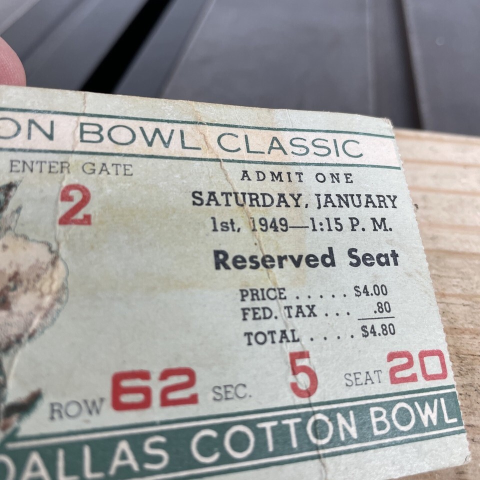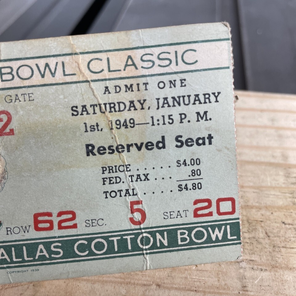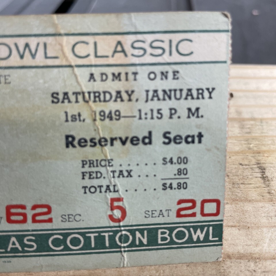 Cotton Bowl Classic 1949 ticket stub SMU mustangs Vs Oregon Webfoots Dallas TX.