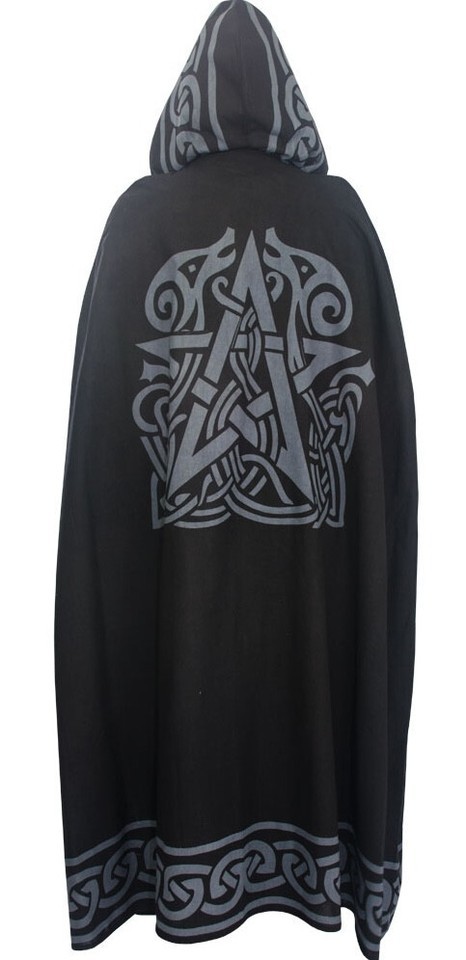 This lightweight black cloak has a gray pentacle on the back and a large gray